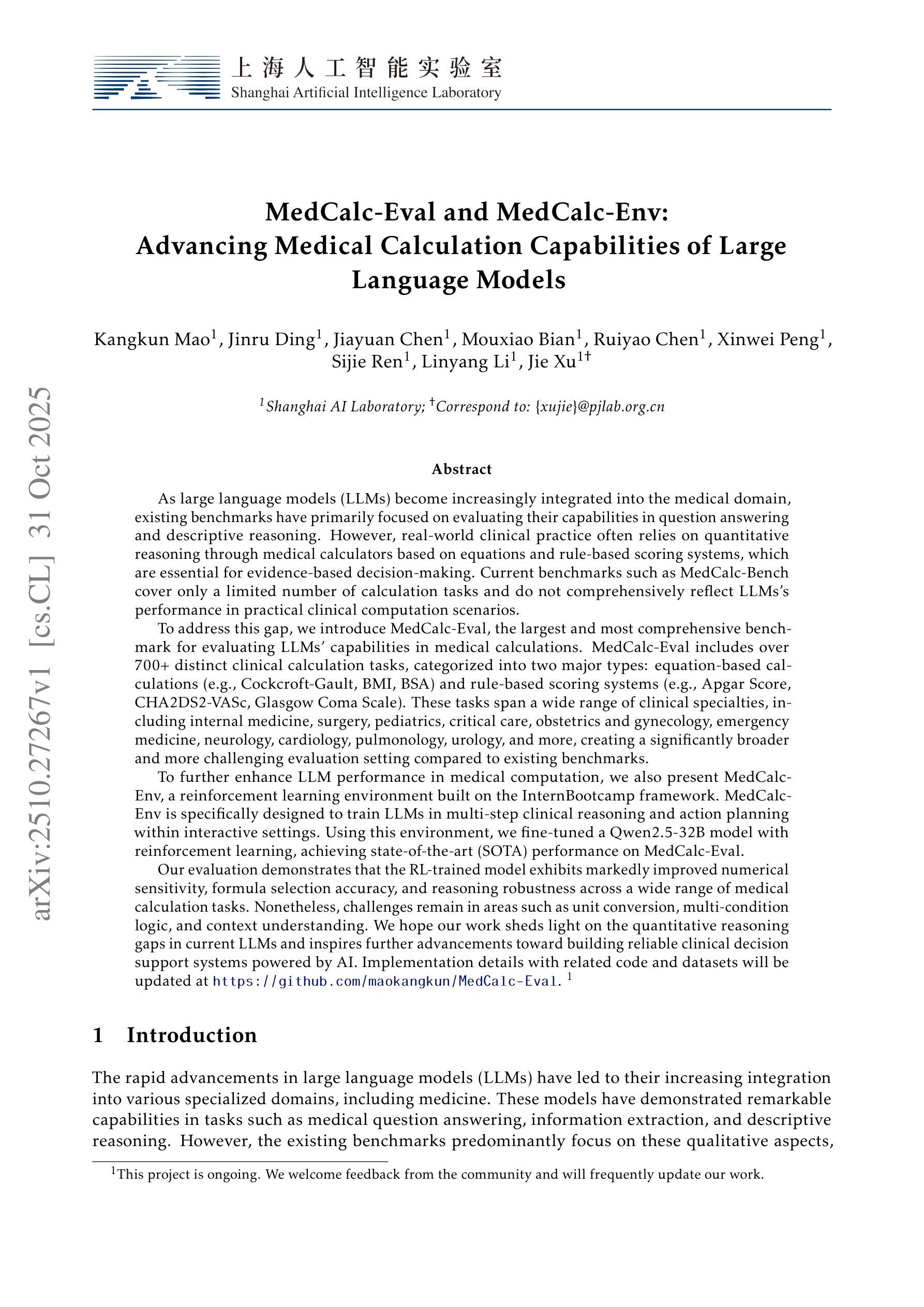 随着大型语言模型(LLM)进入医学领域,大多数基准测试都在问答或描述性推理方面对它们进行评估,忽视了临床决策至关重要的定量推理。现有数据集如MedCalc-Bench涵盖的计算任务较少,无法反映现实世界的计算场景。我们推出MedCalc-Eval,这是评估LLM医疗计算能力的大型基准测试,包含700多个任务,分为两类:基于方程的任务(例如Cockcroft-Gault、BMI、BSA)和基于规则评分系统的任务(例如Apgar、Glasgow昏迷量表)。这些任务涵盖内科、外科、儿科和心脏病学等多个专业,提供更广泛和更具挑战性的评估环境。为了提高性能,我们进一步开发了基于InternBootcamp框架的MedCalc-Env强化学习环境,支持多步骤的临床推理和规划。在此环境中对Qwen2.5-32B模型进行微调,在MedCalc-Eval上达到最新结果,在数字敏感度、公式选择和推理稳健性方面取得了显著进展。剩余的挑战包括单位转换、多条件逻辑和上下文理解。数据集和代码可通过https://github.com/maokangkun/MedCalc-Eval获取。