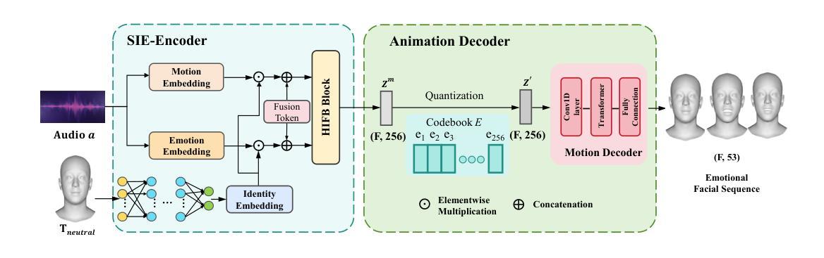 提出了一种名为LSF-Animation的新型框架,该框架能够从语音中隐式提取情感信息,并从中性面部网格中捕获身份信息,提高了对未见说话者和情感状态的泛化能力,无需手动标签。引入分层交互融合块(HIFB),有效整合情感、运动相关和身份相关线索。在3DMEAD数据集上的实验表明,该方法在情感表达、身份泛化和动画真实性方面超越了最新的先进技术。