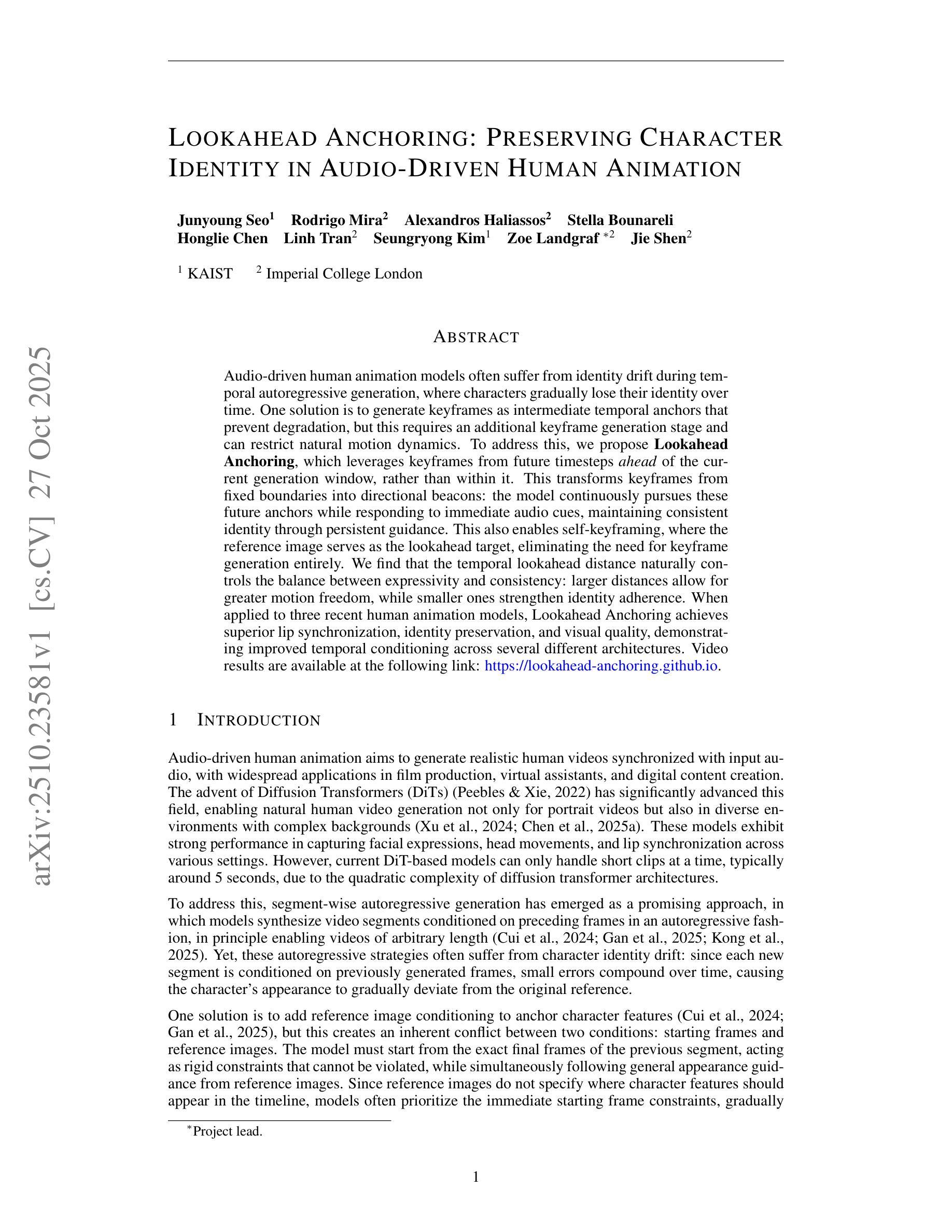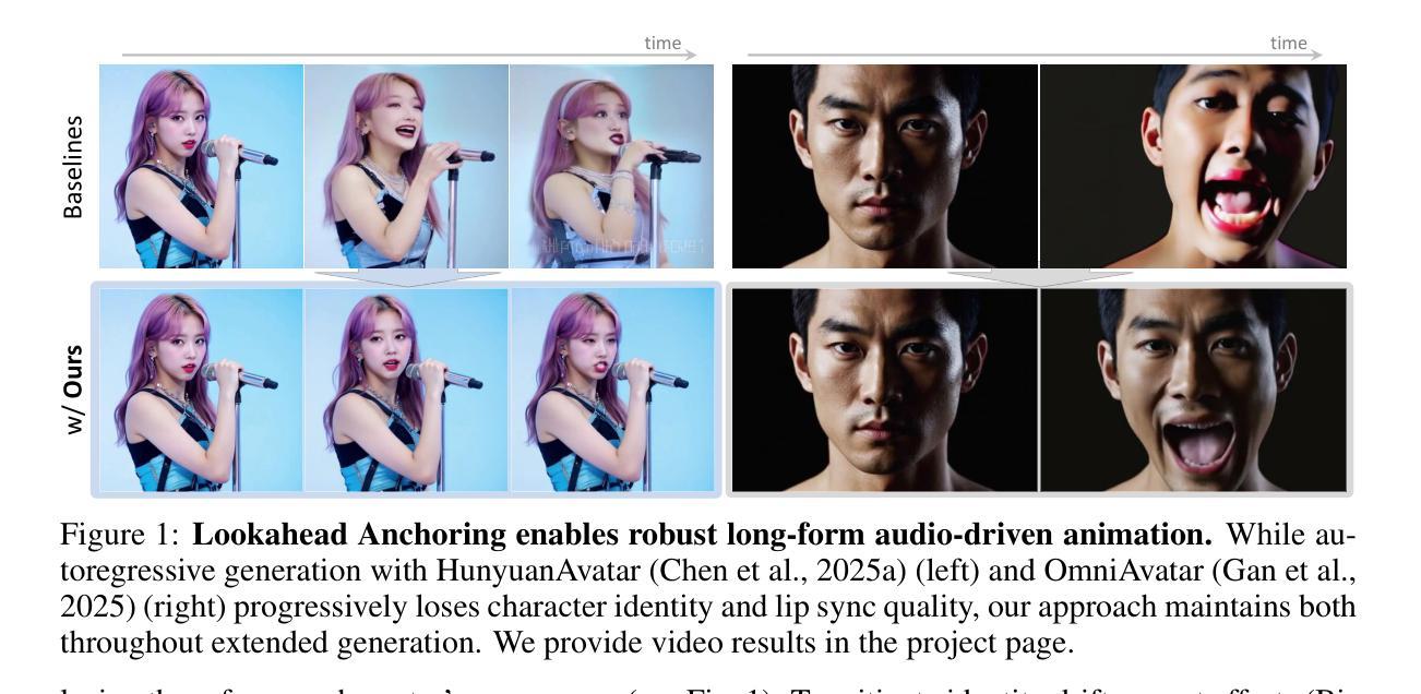 基于音频驱动的人物动画模型在时间自回归生成过程中会出现身份漂移问题,即角色随时间逐渐失去其身份特征。一种解决方案是生成关键帧作为中间时间锚点以防止退化,但这需要额外的关键帧生成阶段,并可能限制自然运动动态。为解决这一问题,我们提出前瞻锚定(Lookahead Anchoring)方法,它利用当前生成窗口之外未来时刻的关键帧,将关键帧从固定边界转变为方向指示标。模型在持续追求这些未来锚点的同时,响应即时音频线索,通过持续指导保持身份一致性。这还包括自我关键帧生成功能,其中参考图像作为前瞻目标,完全消除了对关键帧生成的需求。我们发现前瞻距离自然地控制了表现力和一致性之间的平衡:较大的距离允许更大的运动自由度,而较小的距离则增强了身份的一致性。将Lookahead Anchoring应用于三个近期的人物动画模型后,在唇同步、身份保留和视觉质量方面取得了显著优势,并在多种架构中展示了改进的时间条件。相关视频结果可通过以下链接查看:https://lookahead-anchoring.github.io。