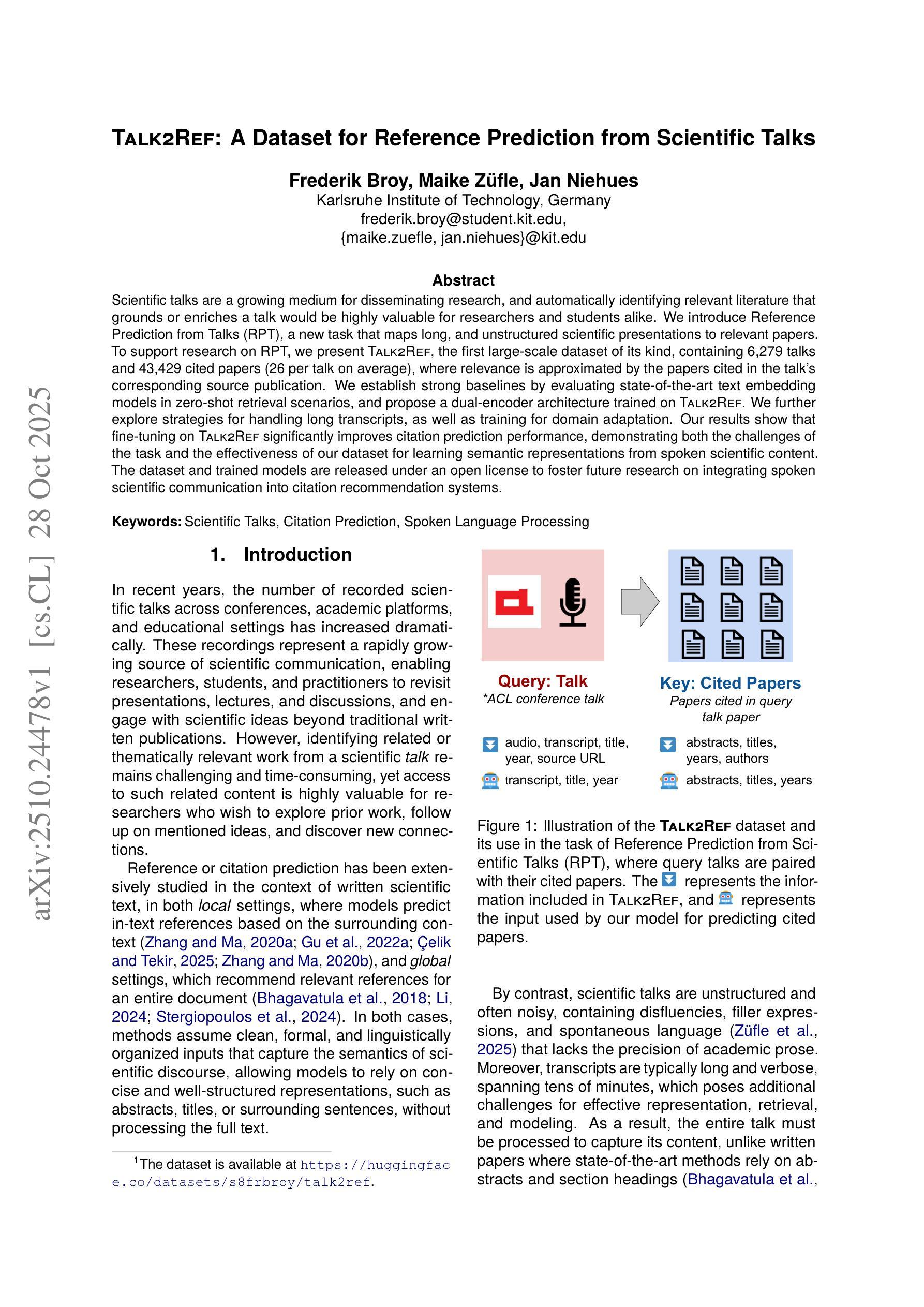 本文介绍了从演讲中预测参考文献(RPT)的新任务,该任务旨在将长且非结构的科学演讲与相关的论文相匹配。为支持RPT研究,文章推出了Talk2Ref数据集,包含6,279个演讲和43,429篇被引用的论文(平均每篇演讲有26篇论文)。文章评估了最先进的文本嵌入模型在零样本检索场景中的表现,并提出了一种在Talk2Ref上训练的双重编码器架构。此外,文章还探讨了处理长文本的策略以及领域适应性的训练策略。实验结果表明,在Talk2Ref上进行微调可以显著提高引用预测性能,这既体现了该任务的挑战性,也证明了数据集从口头科学内容中学习语义表示的有效性。数据集和训练好的模型以开放许可方式发布,以促进将来将口头科学交流融入引文推荐系统的研究。