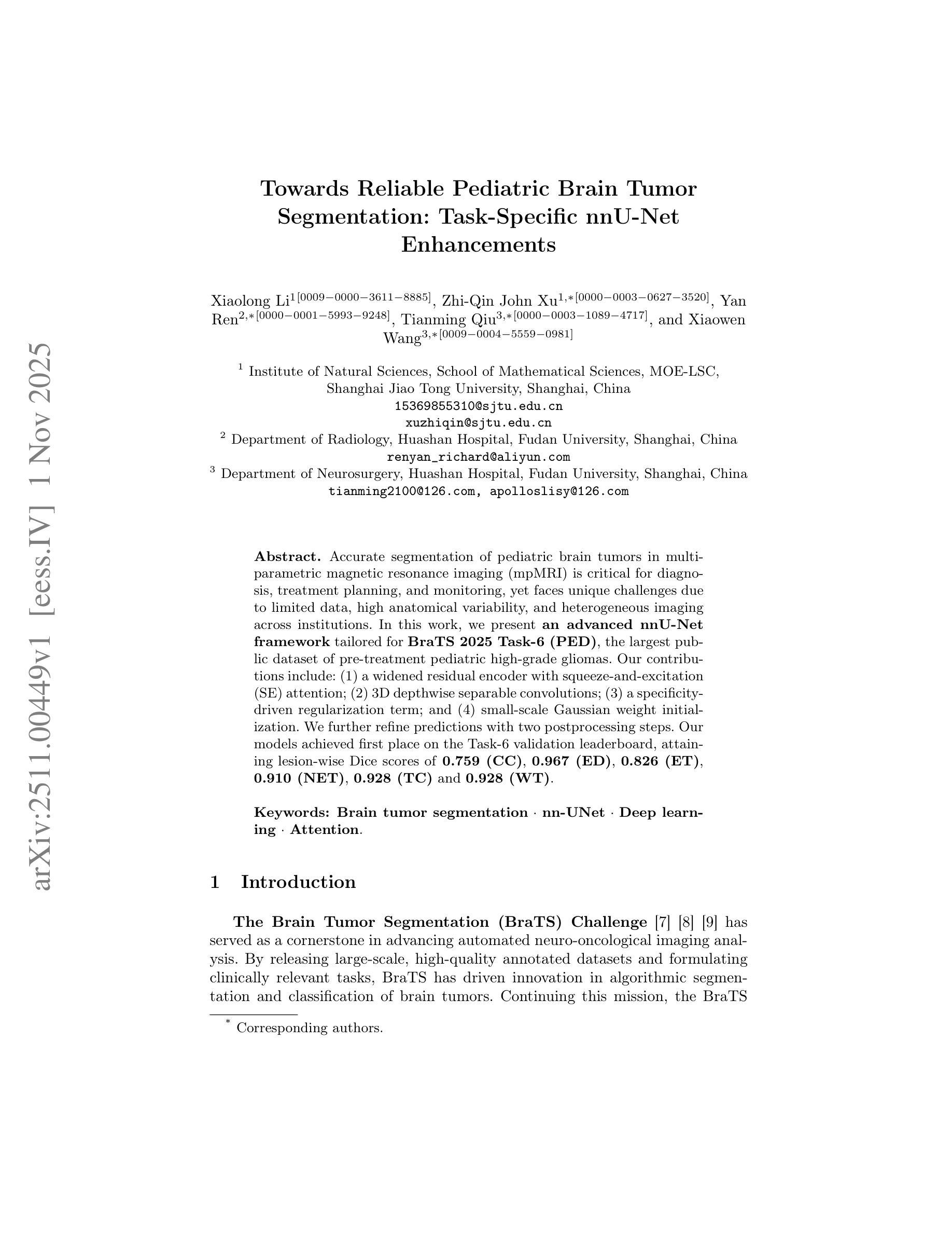 基于多参数磁共振成像(mpMRI)对小儿脑肿瘤进行精确分割对于诊断、治疗规划和监测至关重要。本研究采用先进的nnU-Net框架,针对BraTS 2025 Task-6(PED)进行定制化设计,该方法包含一系列创新贡献,如宽残差编码器与挤压激发(SE)注意力机制、3D深度可分离卷积、特异性驱动的正则化术语以及小尺度高斯权重初始化等。通过两个后处理步骤进一步优化预测结果,模型在Task-6验证排行榜上获得第一名,各病灶Dice得分表现优异。