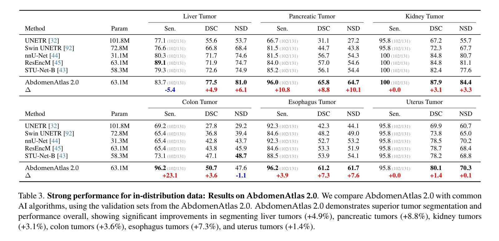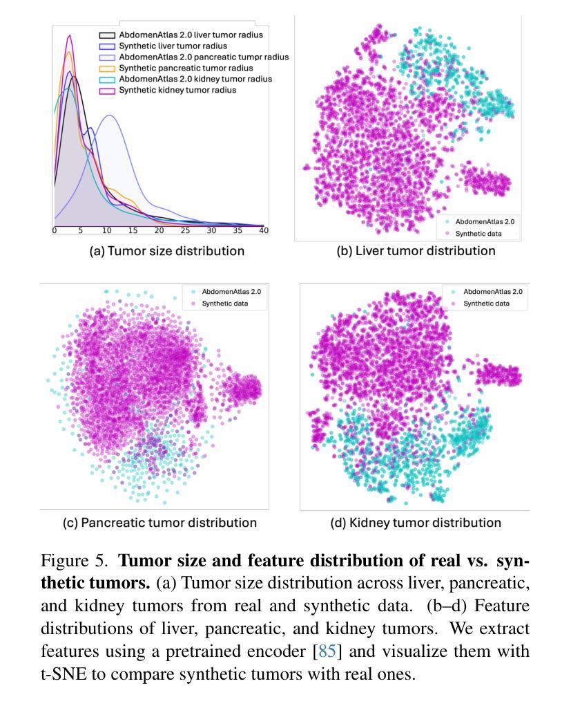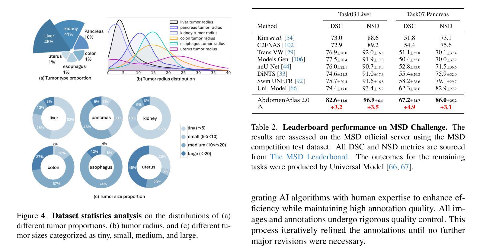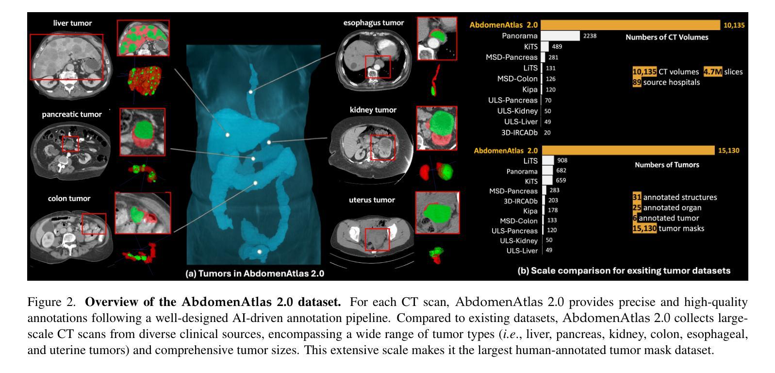 肿瘤分割人工智能受限于大规模、逐像素注释数据集的缺乏,创建此类数据集困难且需要医学专家。在自有JHH胰腺肿瘤扫描数据集(含3000个注释)中发现,AI性能在1500个扫描后不再提升。合成数据的使用仅使用500个真实扫描即达到相同性能,显示合成数据可优化数据缩放法则,比单独使用真实数据更高效训练模型。基于这些经验,创建了AbdomenAtlas 2.0数据集,包含手动逐像素注释的六个器官(胰腺、肝脏、肾脏、结肠、食道和子宫)的肿瘤实例共15,130个,控制扫描数量达数千张。专家放射科医生标注的数据集比现有公共肿瘤数据集大几个数量级。目前版本已基于JHH数据集的经验为训练AI分割六个器官的肿瘤提供了坚实基础,相较于公共数据集有显著改进,在内部测试中可提高DSC得分7%,外部测试中提高DSC得分达16%。