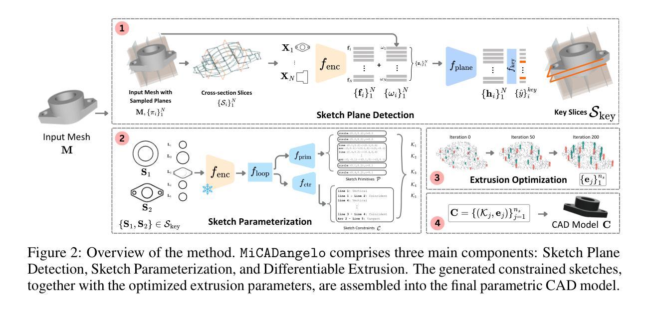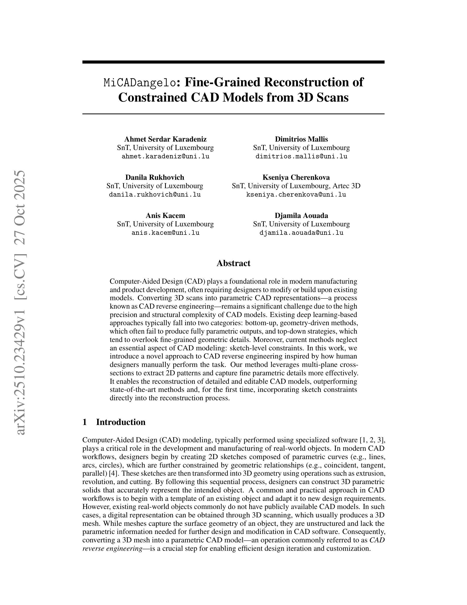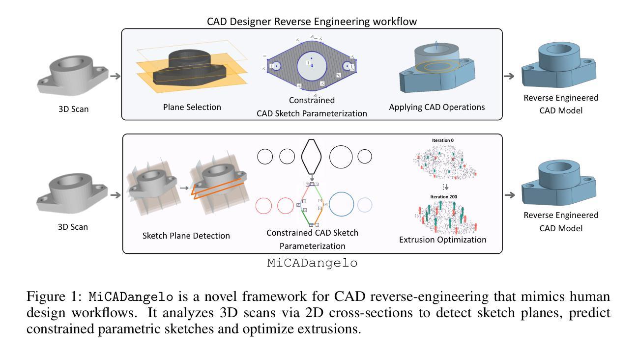 该文介绍了计算机辅助设计(CAD)在现代制造业和产品开发中的重要性,以及将3D扫描转换为参数化CAD表示(即CAD逆向工程)的挑战。现有深度学习方法存在不足,无法完全满足需求。本文提出了一种受人类设计师手动操作启发的新方法,利用多平面截面提取2D模式,更有效地捕捉精细参数细节,并首次将草图约束直接纳入重建过程,能够重建详细且可编辑的CAD模型。