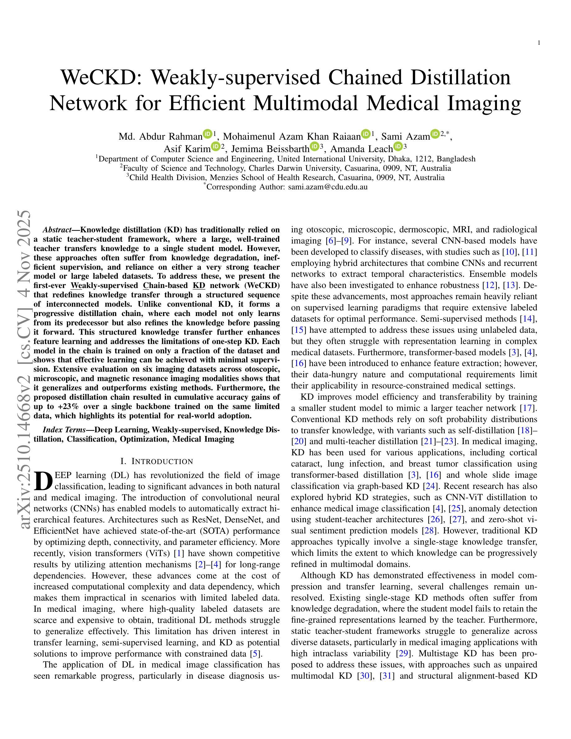 本文介绍了一种新型的弱监督链式知识蒸馏网络(WeCKD),该网络通过一系列互联模型进行结构化知识转移,解决了传统知识蒸馏中的知识退化、监督效率低下以及对强教师模型或大量标记数据集的依赖问题。WeCKD形成了一种渐进式的蒸馏链,每个模型不仅从前一个模型学习,还精炼知识后传递给下一个模型。这种结构化的知识转移提高了特征学习能力,并克服了一步知识蒸馏的局限性。在六个成像数据集上的广泛评估表明,该方法在耳镜、显微镜和磁共振成像等多种模态下具有通用性并优于现有方法。此外,与在相同有限数据上训练的单一主干相比,蒸馏链的累积准确率提高了高达+23%,突显了其在实际应用中的潜力。