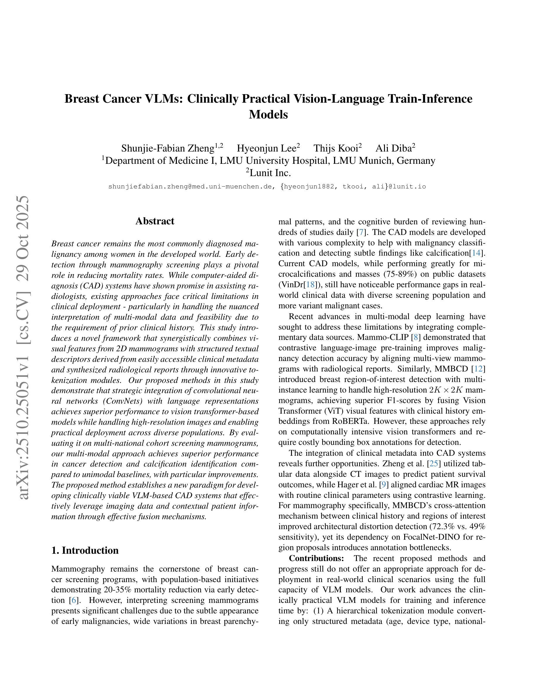 - 本研究结合二维乳腺钼靶的视觉特征与从临床元数据和放射学报告中派生的结构化文本描述符。