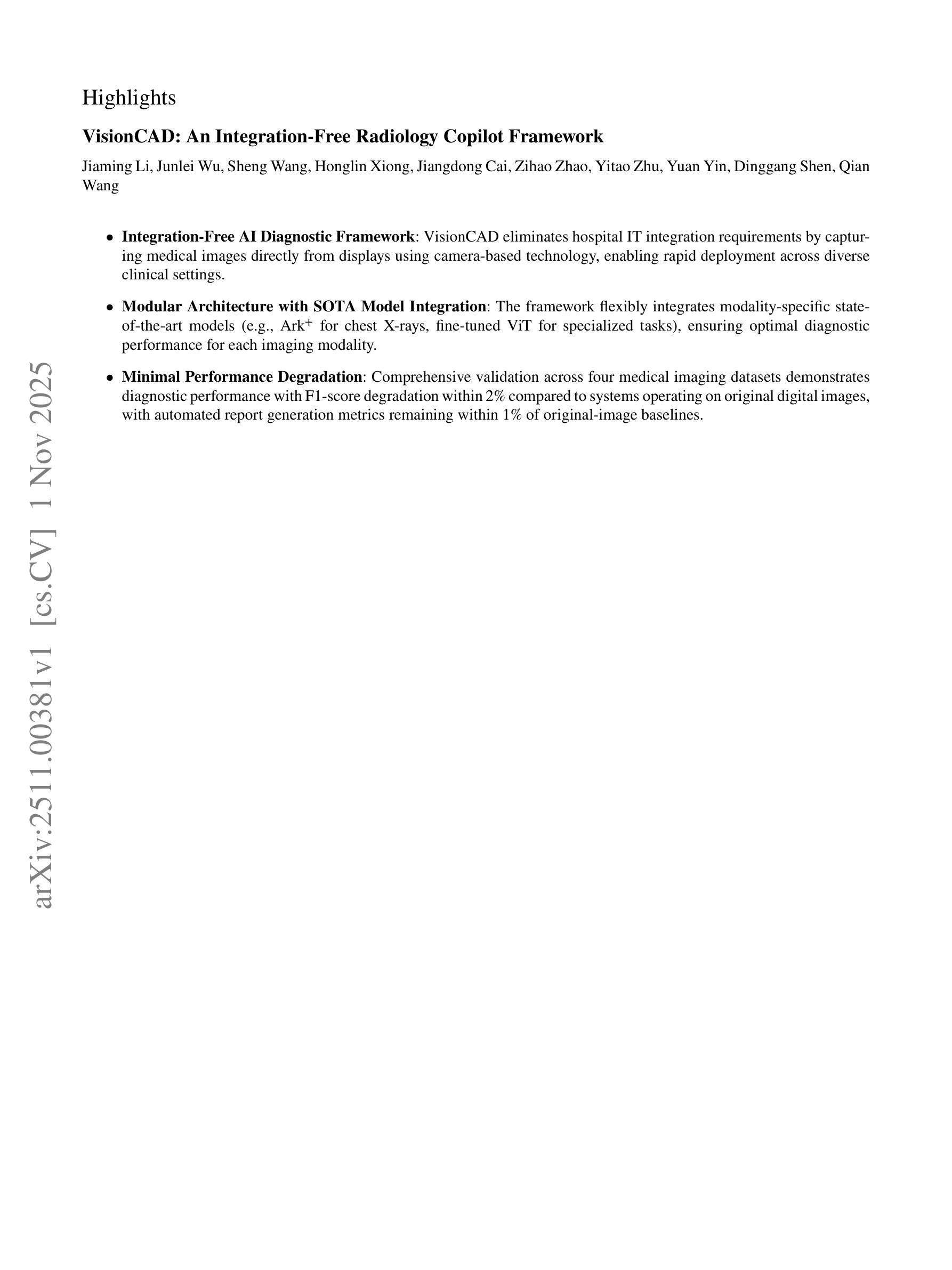- VisionCAD是一个基于视觉的放射辅助诊断框架,通过相机系统直接捕获屏幕上的医学图像。