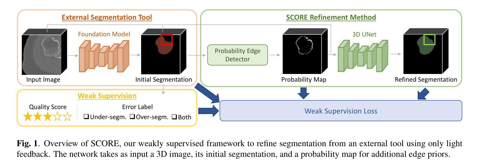 在医学图像分析中,划定解剖区域是一项关键任务。手动分割可以实现较高的准确性,但劳动强度大且易出现差异,从而推动了自动化方法的发展。最近,一系列基础模型已经实现了跨不同解剖结构和成像方式的自动分割,但这些可能并不总能达到临床精度标准。虽然分割细化策略可以提高性能,但当前的方法依赖于大量的用户交互或为训练需要大量完全监督的分割。在这里,我们提出了SCORE(基于区域评估的分割校正),这是一个弱监督框架,它能够在训练期间仅使用轻量级反馈来学习改进蒙版预测。具体来说,SCORE不是依赖于密集的训练图像注释,而是引入了一种新型损失函数,该损失函数利用区域质量分数和过度或不足的分割误差标签。我们在肱骨CT扫描中展示了SCORE的应用,它能显著改进TotalSegmentator的初步预测结果,实现与现有细化方法相当的性能,同时大大降低其监督要求和注释时间。我们的代码可在以下网址找到:https://gitlab.inria.fr/adelangl/SCORE。