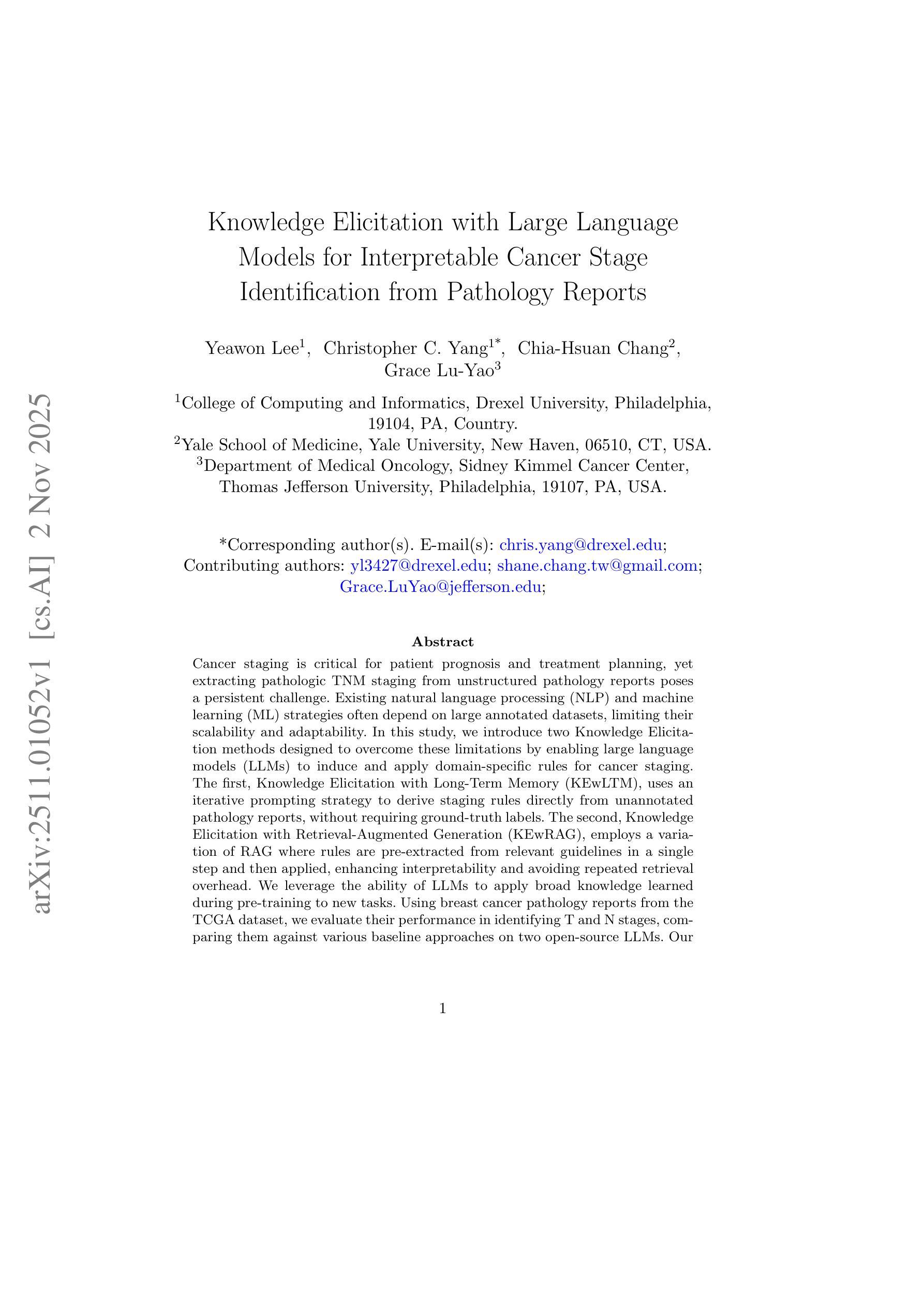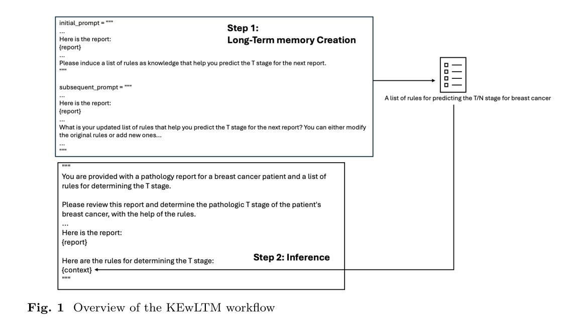 癌症分期对患者的预后和治疗计划至关重要,但从非结构化病理报告中提取病理TNM分期是一个持续存在的挑战。现有的自然语言处理(NLP)和机器学习(ML)策略通常依赖于大量标注数据集,这限制了它们的可扩展性和适应性。在这项研究中,我们介绍了两种知识提取方法,旨在克服这些限制,使大型语言模型(LLM)能够诱导和应用癌症分期的领域特定规则。第一种是“基于长期记忆的知识提取”(KEwLTM),它使用迭代提示策略直接从未标注的病理报告中推导分期规则,无需真实标签。第二种是“基于检索增强生成的知识提取”(KEwRAG),它采用RAG的变体,一次性从相关指南中提取规则,然后应用这些规则,提高可解释性,避免重复检索开销。我们利用LLM将预训练过程中学习到的广泛知识应用于新任务的能力。我们利用TCGA数据集中的乳腺癌病理报告,评估它们在识别T和N阶段的能力,与两种开源LLM的各种基线方法进行比较。我们的结果表明,当零射击思维链(ZSCOT)推理有效时,KEwLTM的表现优于KEwRAG,而当ZSCOT推理效果较差时,KEwRAG的表现更好。两种方法都通过使诱导的规则明确来提供透明、可解释的界面。这些发现突显了我们知识提取方法作为可伸缩、高性能的自动癌症分期解决方案的潜力,特别是在有限标注数据的临床环境中,它们具有增强的可解释性。