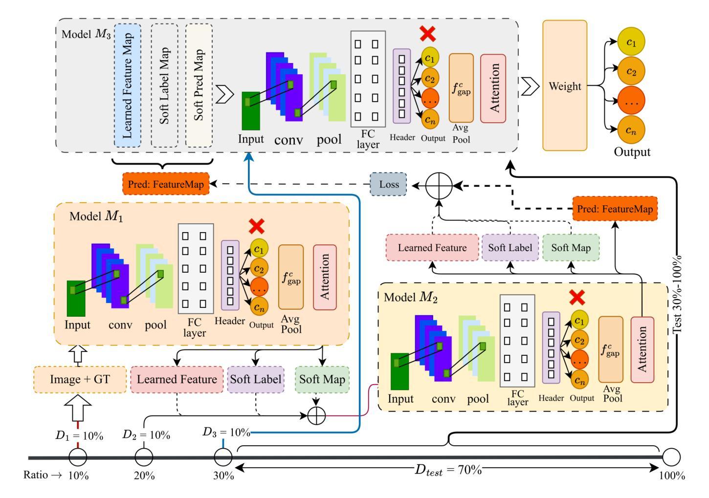 知识蒸馏(KD)传统上依赖于静态的教师-学生框架,其中大型、训练良好的教师模型将知识转移给单一的学生模型。然而,这些方法常常遭受知识退化、监督效率低下以及依赖非常强大的教师模型或大量标注数据集的困扰。为了解决这些问题,我们首次提出了弱监督链式KD网络(WeCKD),它通过一系列相互连接的结构化模型重新定义知识转移。不同于传统的KD,它形成了一个渐进的蒸馏链,其中每个模型不仅从它的前身中学习,还精炼知识后再向前传递。这种结构化的知识转移进一步增强了特征学习,并解决了一步KD的局限性。链中的每个模型只在数据集的一部分上进行训练,并证明在最小监督下可以实现有效的学习。在耳镜、显微镜和磁共振成像等六种成像数据集上的广泛评估表明,它具有良好的通用性并在现有方法上表现出优越性。此外,与在相同有限数据上训练的单个主干相比,所提出的知识蒸馏链的累积精度提高了高达+23%,这突显了其在实际应用中的潜力。