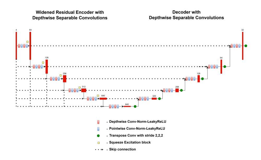 - 模型的贡献包括宽残差编码器与挤压激发(SE)注意力机制、3D深度可分离卷积等创新技术。