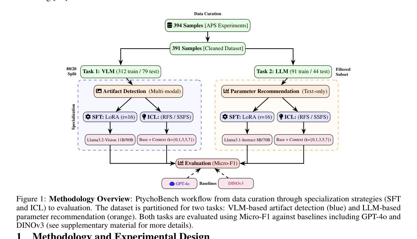 本文介绍了一个名为PtychoBench的多模态多任务基准测试平台,该平台旨在解决先进显微镜工作流程自动化中面临的模型域适应性问题。通过该平台,本文对比了两种专业化策略:监督微调(SFT)和上下文学习(ICL)。在视觉伪物检测任务和文本参数推荐任务上的实验结果表明,最佳的专业化路径依赖于任务特性。视觉任务中,SFT和ICL相互补充,通过上下文感知的示例引导微调模型取得最高平均性能(Micro-F1为0.728)。而文本任务中,在大规模基础模型上进行ICL是更优策略,达到峰值Micro-F1为0.847,超越了强大的“超级专家”SFT模型(零样本Micro-F1为0.839)。研究还确认了上下文感知提示的优势,并发现了微调模型中一致性的上下文干扰现象。本文的研究结果对比了强大的基线模型,如GPT-4o和基于DINOv3的分类器,为科学人工智能提供了关键观察:在我们的基准测试中,最佳的专业化路径依赖于任务模式态,为开发更有效的科学基础代理系统提供了清晰框架。