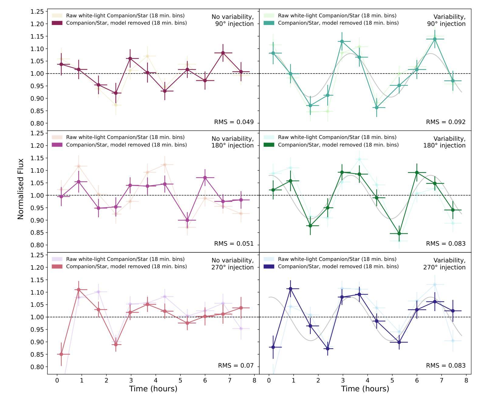 亚恒星伴侣(如外行星和棕矮星)表现出的亮度变化源于其大气层顶部的非均匀性,为我们提供了对其大气结构和动力学的见解。通过结合差分光谱光度监测技术与高对比度成像技术,可以从地面测量高对比度伴侣的光变曲线中的这种变化。然而,地面观测对地球大气湍流的影响很敏感,虽然自适应光学(AO)系统和专用数据处理技术有助于缓解这一问题,但残留的系统效应可能会限制光度精度。在这里,我们对自适应光学系统和矢量掩星相位板仪器获得的数据注入了人工伴侣,以测试地球大气和其他系统污染对这些光变曲线的影响程度,以及已知的可变信号可以恢复得多么完好。我们发现,可变伴侣与不可变伴侣之间是可区分的,但当观测覆盖的周期数较少时,无法准确恢复变化幅度和周期。残留的系统效应仍然高于光曲线中的光子噪声,但尚未达到噪声下限。我们还模拟观测以评估特定系统来源(如非公共路径像差和自适应光学残差)如何影响伴随星通过瞳孔稳定数据时的孔径光度测量。我们表明,只有低阶像差才可能影响流量测量,但热背景噪声是原始伴随星光度测量中的主要散射源。预测控制和焦平面波前传感技术将帮助进一步减少此类数据的系统效应。