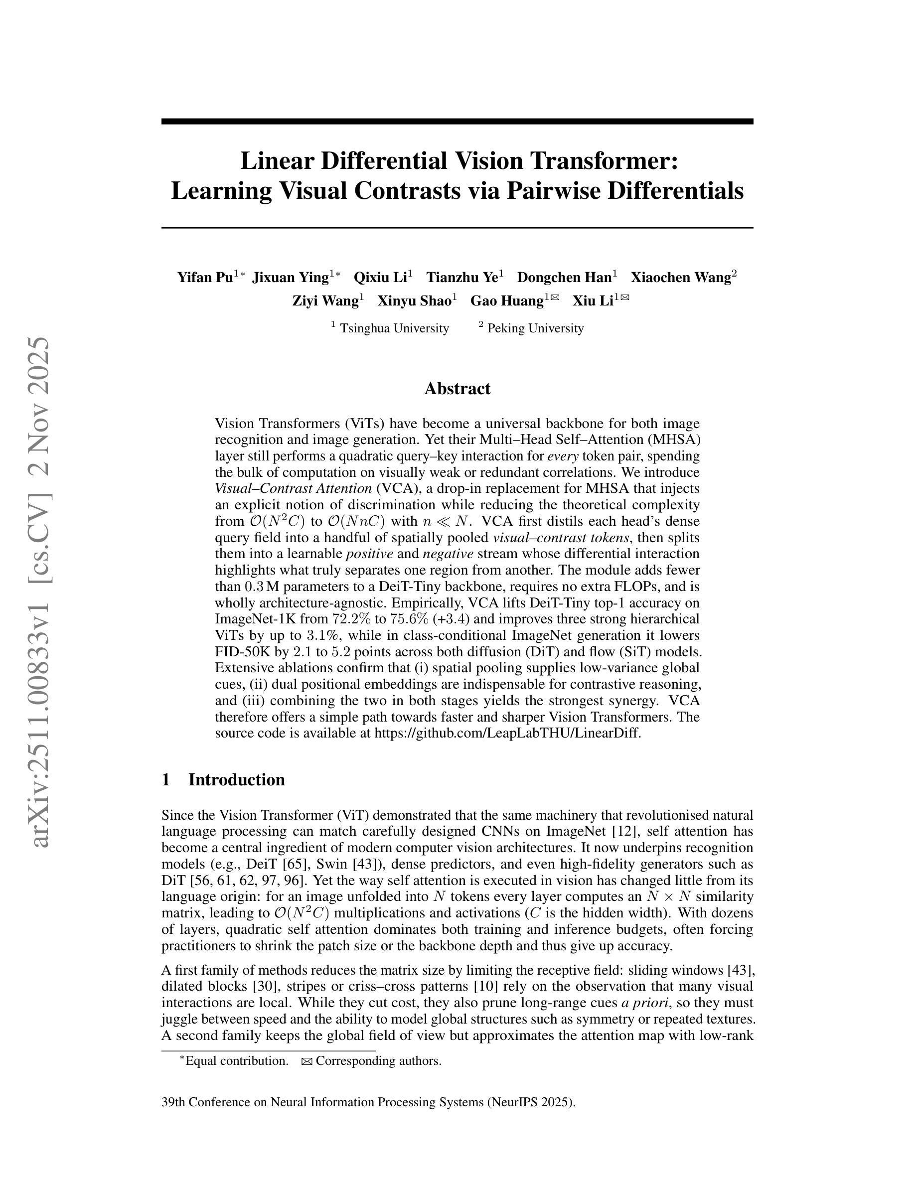 视觉转换器(ViTs)已成为图像识别和图像生成的通用主干。然而,其多头自注意力(MHSA)层仍对每对令牌执行二次查询键交互,将大量计算用于视觉较弱或冗余的相关性。我们引入了视觉对比注意力(VCA),作为MHSA的替代品,在减少理论复杂度从O(N^2 C)到O(N n C)的同时,注入了明确的鉴别概念,其中n<<N。VCA首先提炼每个头部的密集查询字段为少量的空间池化视觉对比令牌,然后将其分为可学习的正负流,其差异交互突出了真正区分一个区域与其他区域的内容。该模块为DeiT-Tiny主干增加了不到0.3M个参数,无需额外的FLOPs,并且完全独立于架构。经验表明,VCA将DeiT-Tiny在ImageNet-1K上的top-1准确率从72.2%提高到75.6%(+3.4%),并改进了三个强大的分层ViTs高达3.1%,而在类条件ImageNet生成中,它将FID-50K降低2.1至5.2点,适用于扩散(DiT)和流动(SiT)模型。广泛的消融实验证实,(i)空间池提供低方差全局线索,(ii)双位置嵌入对于对比推理至关重要,(iii)在两个阶段中结合两者产生最强协同作用。因此,VCA为更快、更锐利的视觉转换器提供了简单途径。源代码可在https://github.com/LeapLabTHU/LinearDiff找到。