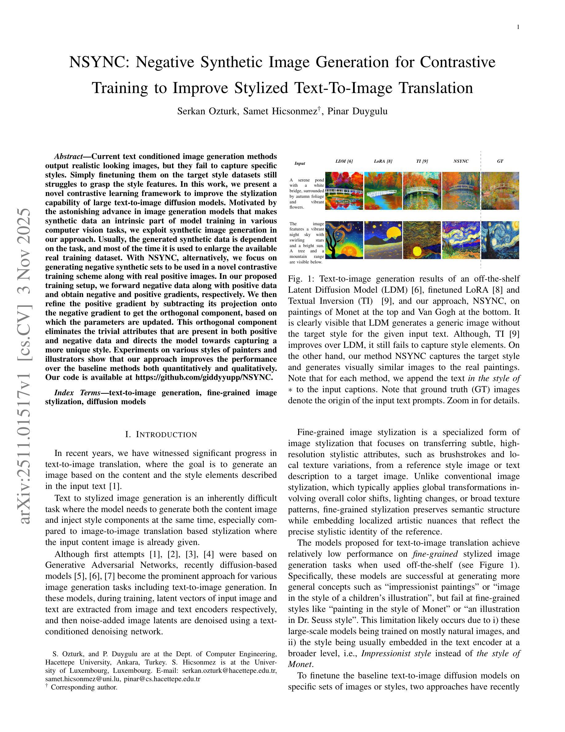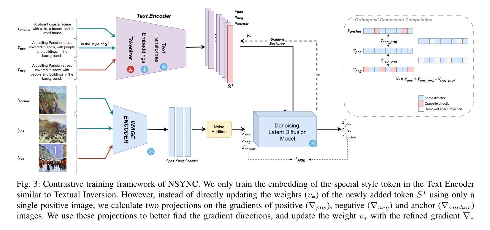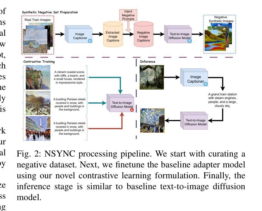 当前基于文本条件的图像生成方法能够输出看起来很逼真的图像,但它们无法捕捉特定的风格。仅通过对目标风格数据集进行微调,仍然难以捕捉风格特征。在这项工作中,我们提出了一种新的对比学习框架,以提高大型文本到图像扩散模型的风格化能力。受图像生成模型的惊人进步的启发,合成数据已成为各种计算机视觉任务中模型训练不可或缺的一部分,我们在方法中利用合成图像生成。通常,生成的合成数据依赖于任务,并且大部分时间用于扩大可用的真实训练数据集。而使用NSYNC方法,我们专注于生成用于新型对比训练方案的负合成集,以及真实的正图像。在我们提出的训练设置中,我们将负数据与前向正数据一起传递,并分别获得负和正梯度。然后,我们通过从正梯度中减去其在负梯度上的投影来细化正梯度,得到正交分量,基于该正交分量更新参数。这个正交分量消除了同时存在于正负数据中的常规属性,并指导模型捕捉更独特的风格。对各种画家和插画师风格的实验表明,我们的方法在定量和定性方面都超过了基线方法。我们的代码可在https://github.com/giddyyupp/NSYNC找到。