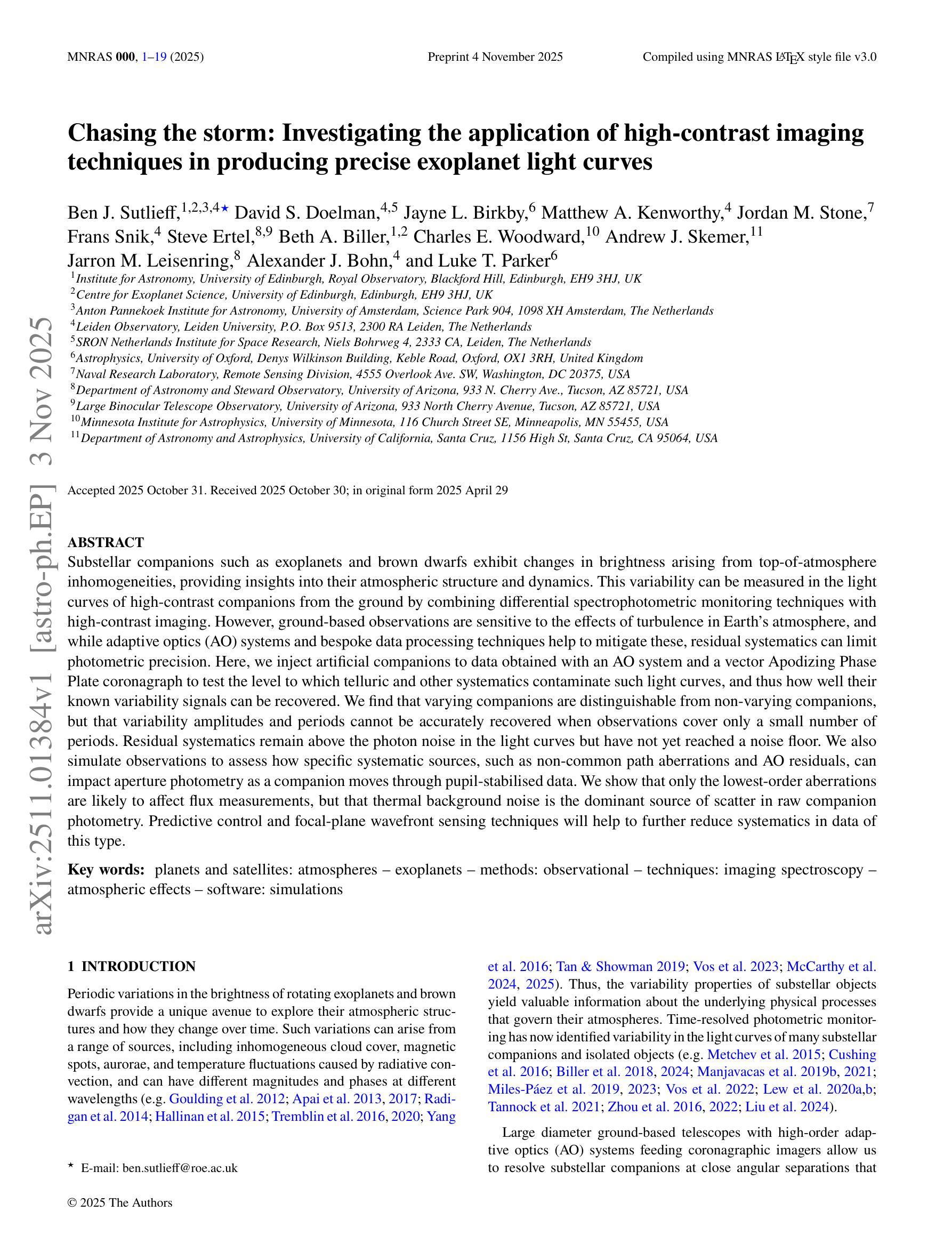 此文本讨论了亚恒星伴侣(如太阳系外行星和棕矮星)的大气结构和动力学的研究。通过结合差分光谱光度监测技术和高对比度成像技术,可以从地面测量这些高对比度伴侣的光变曲线。然而,地面观测会受到地球大气湍流的影响,尽管自适应光学系统和专用数据处理技术有助于减轻这些影响,但残余的系统性误差仍可能限制光度测量的精度。通过向自适应光学系统和矢量孔径掩模器掩星法获得的数据中注入人工伴侣,测试了大气和其他系统误差对光变曲线的污染程度,以及恢复已知变星信号的可能性。研究发现,变星伴侣与非变星伴侣可以区分开,但当观测周期数较少时,变星振幅和周期无法准确恢复。残余系统误差仍高于光子噪声,但尚未达到噪声水平。模拟观测还表明,特定系统误差来源(如非公共路径像差和自适应光学残差)会对伴随物在瞳孔稳定数据中移动时的孔径光度测量产生影响。只有低阶像差可能影响流量测量,而热背景噪声是原始伴随光度测量的主要散射源。预测控制和焦点平面波前传感技术将有助于进一步减少此类数据的系统误差。