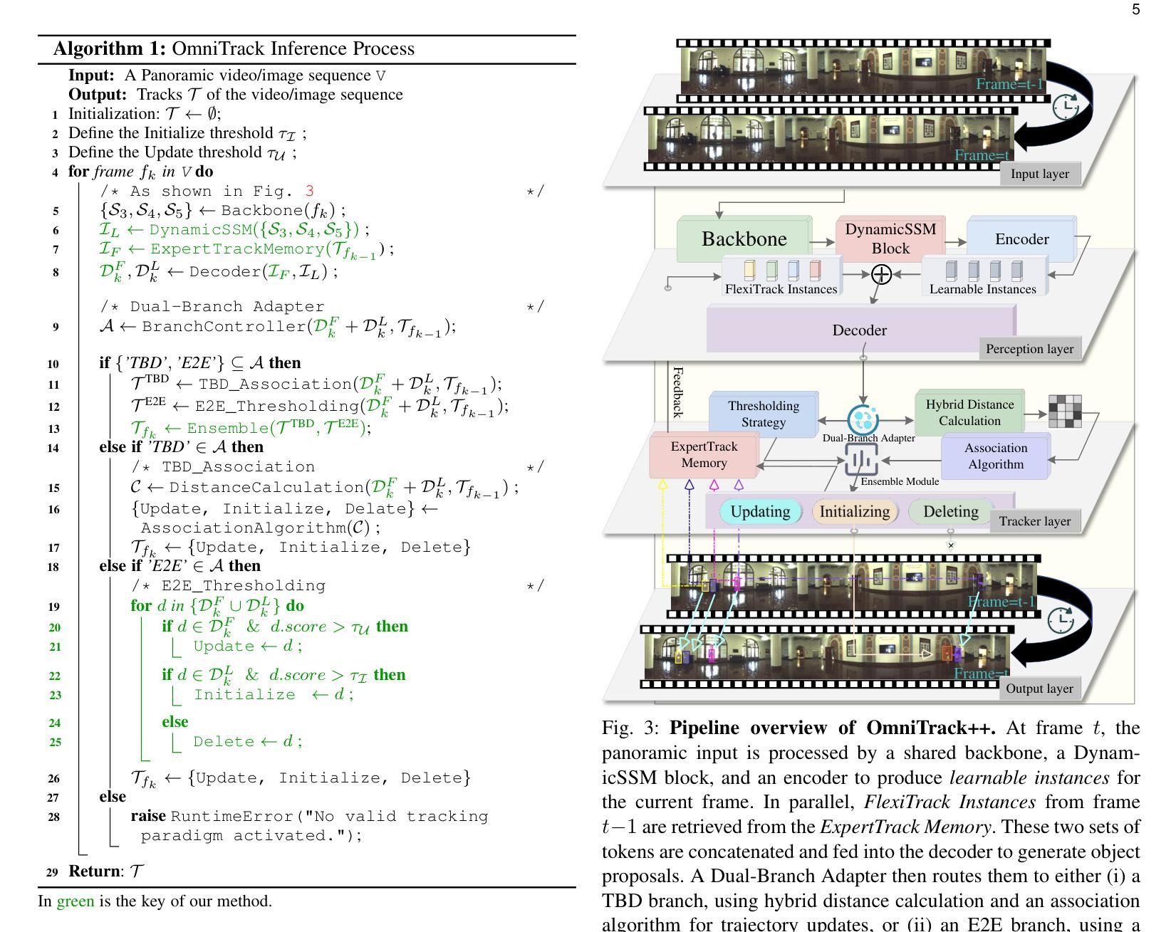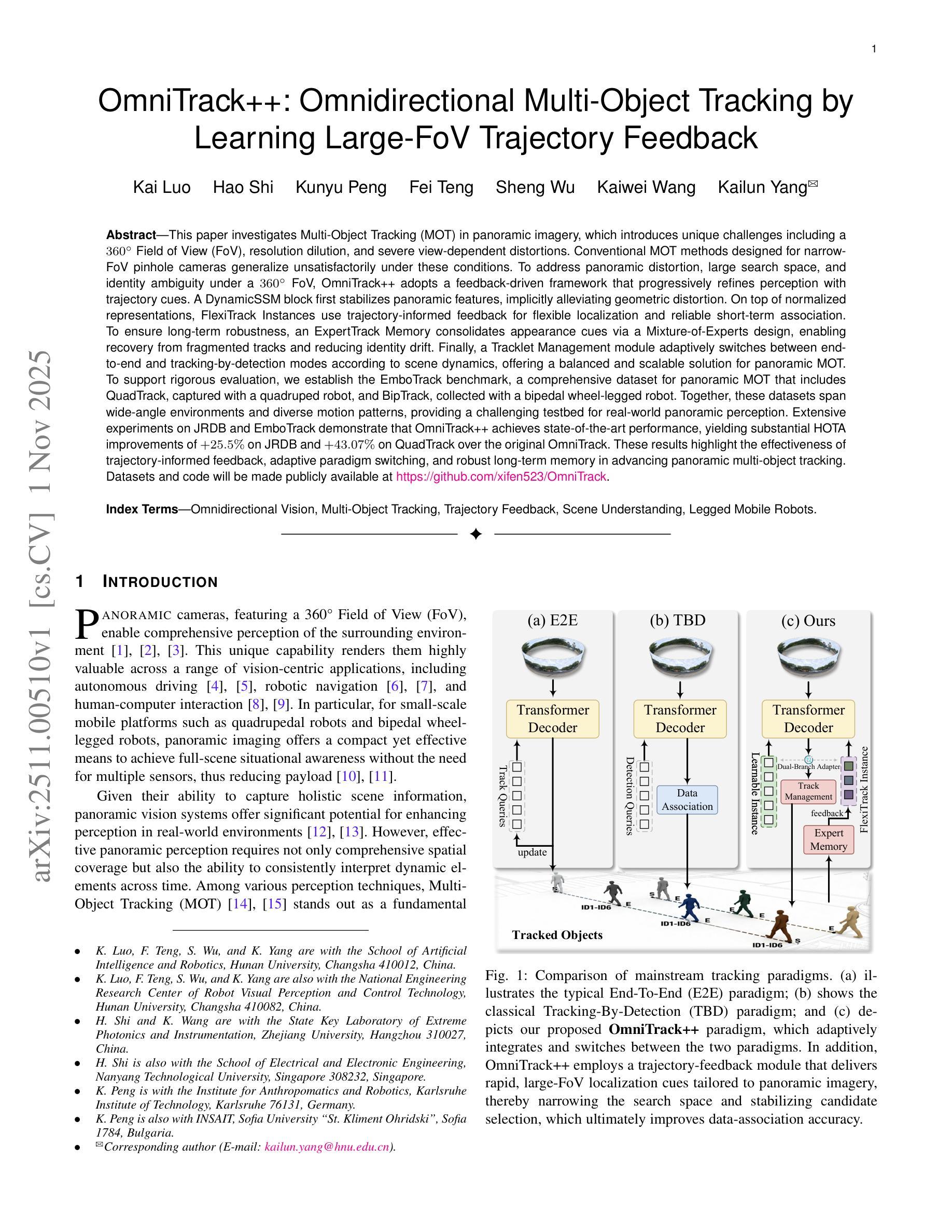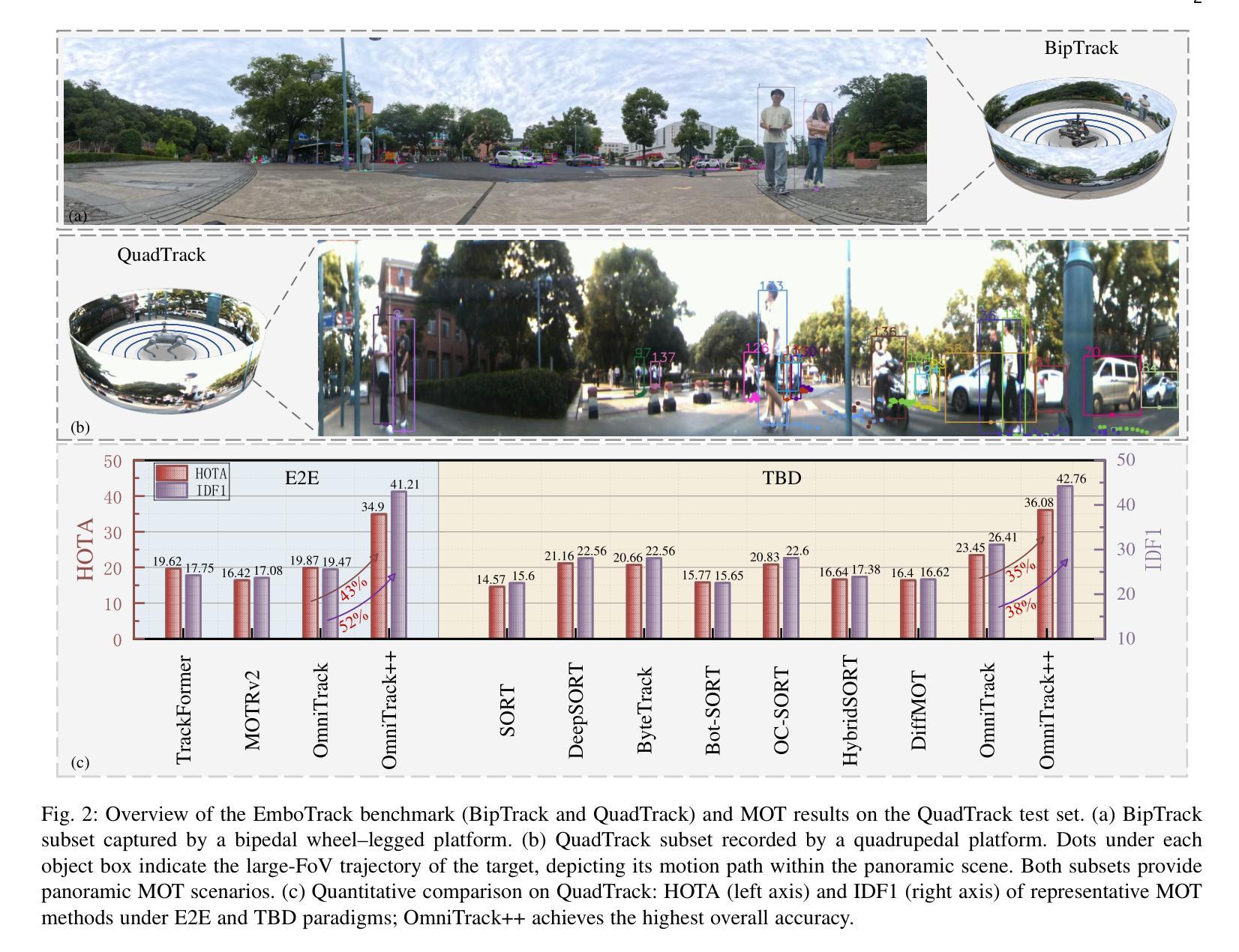 本文研究了全景影像中的多目标跟踪(MOT)问题,针对全景影像的特殊性质如360°视野、分辨率稀释和严重的视角失真等挑战,提出了OmniTrack++方法。该方法采用反馈驱动框架,利用轨迹线索逐步优化感知。通过DynamicSSM模块稳定全景特征,并结合FlexiTrack Instances进行灵活的定位和短期关联。为长期稳健性,ExpertTrack Memory通过混合专家设计巩固外观线索,以恢复断裂的轨迹并减少身份漂移。Tracklet Management模块则根据场景动态自适应切换端到端和跟踪检测模式。此外,建立了EmboTrack基准测试平台,包括QuadTrack和BipTrack数据集,为全景MOT提供了挑战性的测试环境。实验结果表明,OmniTrack++在JRDB和EmboTrack上达到了最先进的性能。