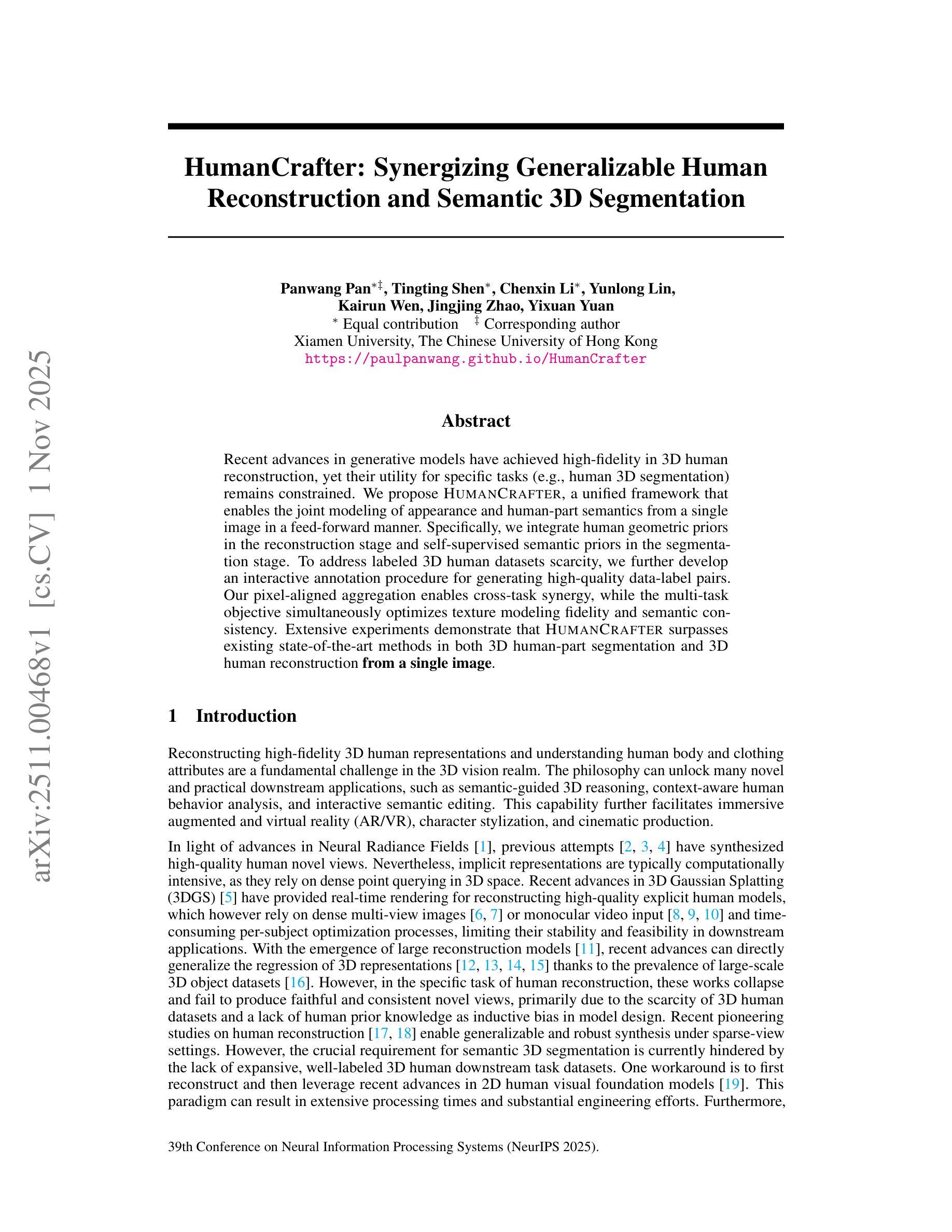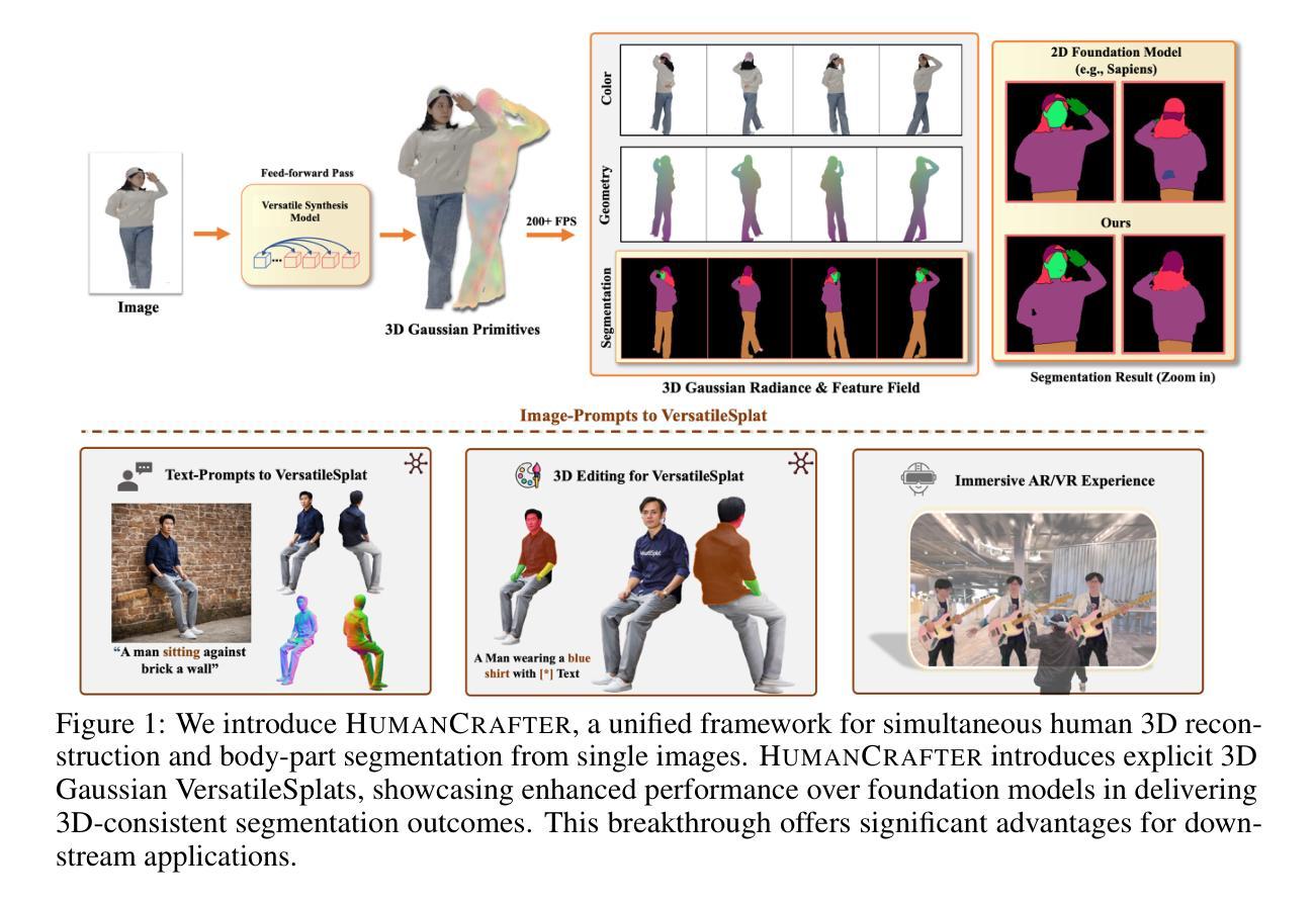 最近生成模型的技术进步已经实现了在三维人体重建中的高保真度,但它们在特定任务(例如三维人体分割)中的实用性仍然受到限制。我们提出了HumanCrafter,这是一个统一框架,能够以前馈方式从单张图像中联合建模外观和人体部位语义。具体来说,我们在重建阶段整合了人体几何先验知识,在分割阶段整合了自监督语义先验知识。为了解决标记的三维人体数据集稀缺的问题,我们还开发了一个交互式注释程序来生成高质量的数据标签对。我们的像素对齐聚合实现了跨任务的协同作用,而多任务目标同时优化了纹理建模的保真度和语义一致性。大量实验表明,HumanCrafter在单图像的三维人体部位分割和三维人体重建方面都超越了现有的最先进方法。