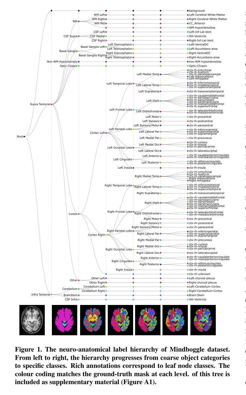 丰富而准确的医学图像分割被定位为支撑下一代由人工智能定义的临床实践。通过对关键解剖结构的精细描绘,为术前规划提供指导,进行实时术中导航,并支持精确的术后评估。然而,对于医学和手术图像分割任务中常用的学习方法会等同惩罚所有错误,因此无法利用标签空间中的类间语义。当标签的数量和丰富性增加,包括微妙的差异时,这变得特别成问题。在这项工作中,我们提出了两种基于树的语义损失函数,它们利用了标签的层次结构组织。我们进一步将我们的损失纳入最近提出的具有稀疏、无背景注释的训练方法中,以扩展我们提出的损失适用性。关于两项医学和手术图像分割任务进行了大量实验报告,即在全监督下进行全脑部分区(WBP)的头部MRI以及具有稀疏注释的场景理解的神经外科高光谱成像(HSI)。结果表明,我们的方法在这两种情况下均达到了最先进的性能。