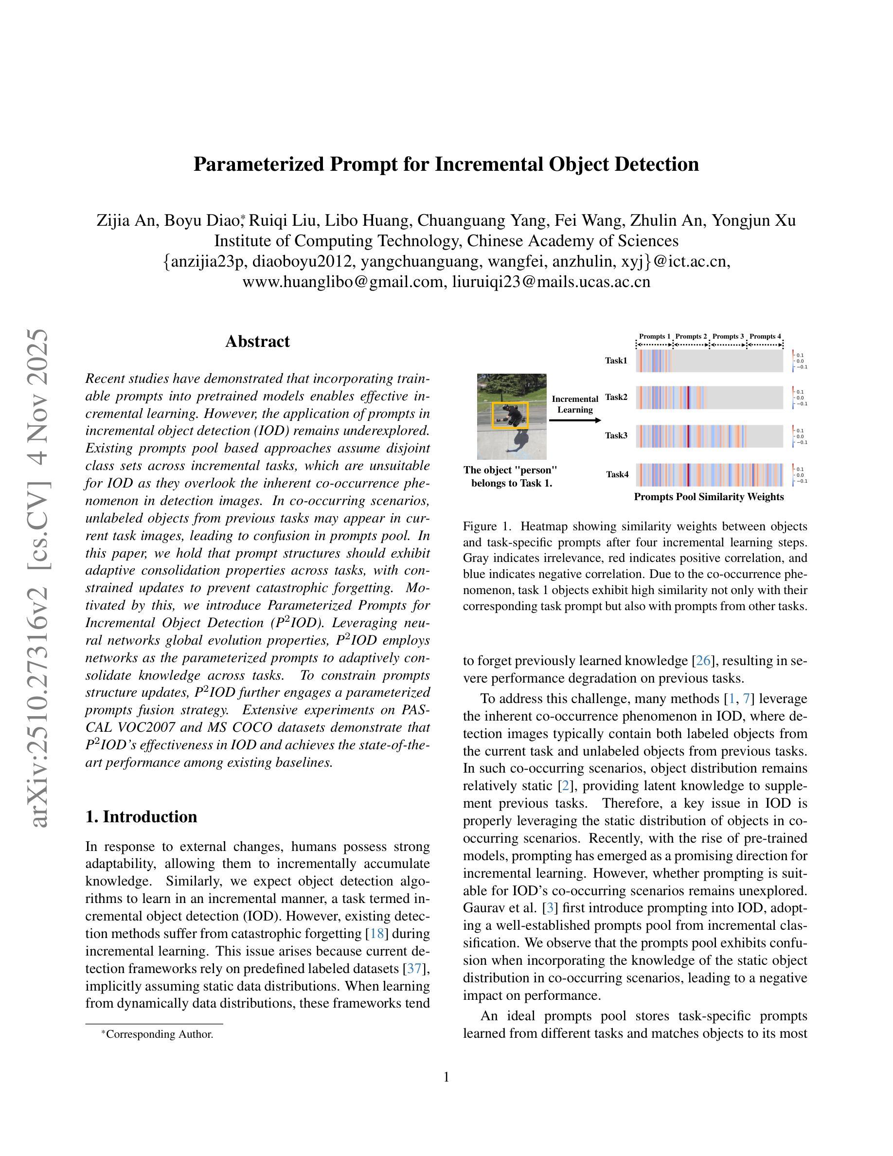 本文研究了在预训练模型中引入可训练提示(prompt)以实现增量学习的有效性。针对增量对象检测(IOD)中的提示应用进行了探索,发现现有基于提示池的方法假设不同任务中的类别集是不重叠的,这在处理检测图像中的固有共现现象时并不适用。共现场景可能导致先前任务的未标记对象出现在当前任务图像中,从而引发提示混淆。本文提出了一种针对增量对象检测的适应性提示结构——参数化提示(P²IOD)。利用神经网络的全局演化特性,P²IOD通过神经网络作为参数化提示来适应性地巩固跨任务知识。同时,为了限制提示结构的更新,P²IOD进一步采用参数化提示融合策略。在PASCAL VOC2007和MS COCO数据集上的大量实验表明,P²IOD在增量对象检测方面的卓越性能,并达到了现有基准的先进水平。