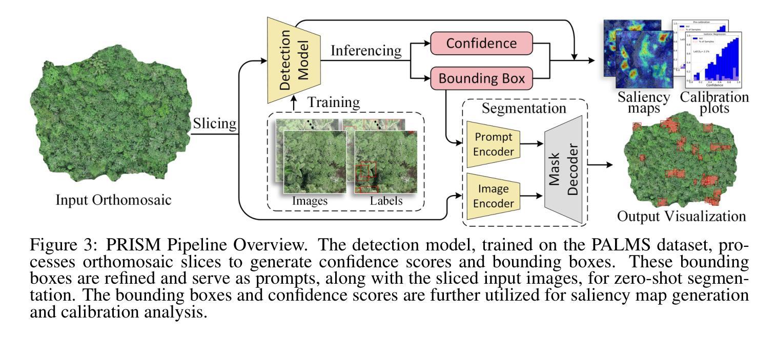 棕榈树作为生态和经济指标,反映了热带雨林健康、生物多样性和人类影响,支持着地方经济和全球森林产品供应链。虽然棕榈树在种植园的检测已经得到了很好的研究,但自然生长的棕榈树在密集森林中的地图绘制工作仍受到树冠重叠、阴影不均和景观异质性的限制。我们开发了PRISM(处理、推断、分割和映射),这是一个灵活的管道,利用大型正射镶嵌图像检测和在热带密集森林中定位棕榈树。正射镶嵌图像是由数千张航空照片制成,并跨越几到数百吉字节。我们的贡献有三点。首先,我们构建了一个大型无人机衍生的正射镶嵌数据集,该数据集收集了厄瓜多尔西部21个生态各异的站点的数据,并用8830个边界框和5026个棕榈树中心点进行标注。其次,我们评估了多个最先进的物体检测器的效率和性能,将零射击SAM 2作为分割主干进行整合,并对结果进行细化,以实现精确地理映射。第三,我们应用校准方法使置信度得分与IoU对齐,并探索显著性地图进行特征解释。虽然PRISM是针对棕榈树进行了优化,但它也可以用于识别其他自然物体,如东部白皮松。未来的工作将探索低分辨率数据集(0.5至1米)的迁移学习。