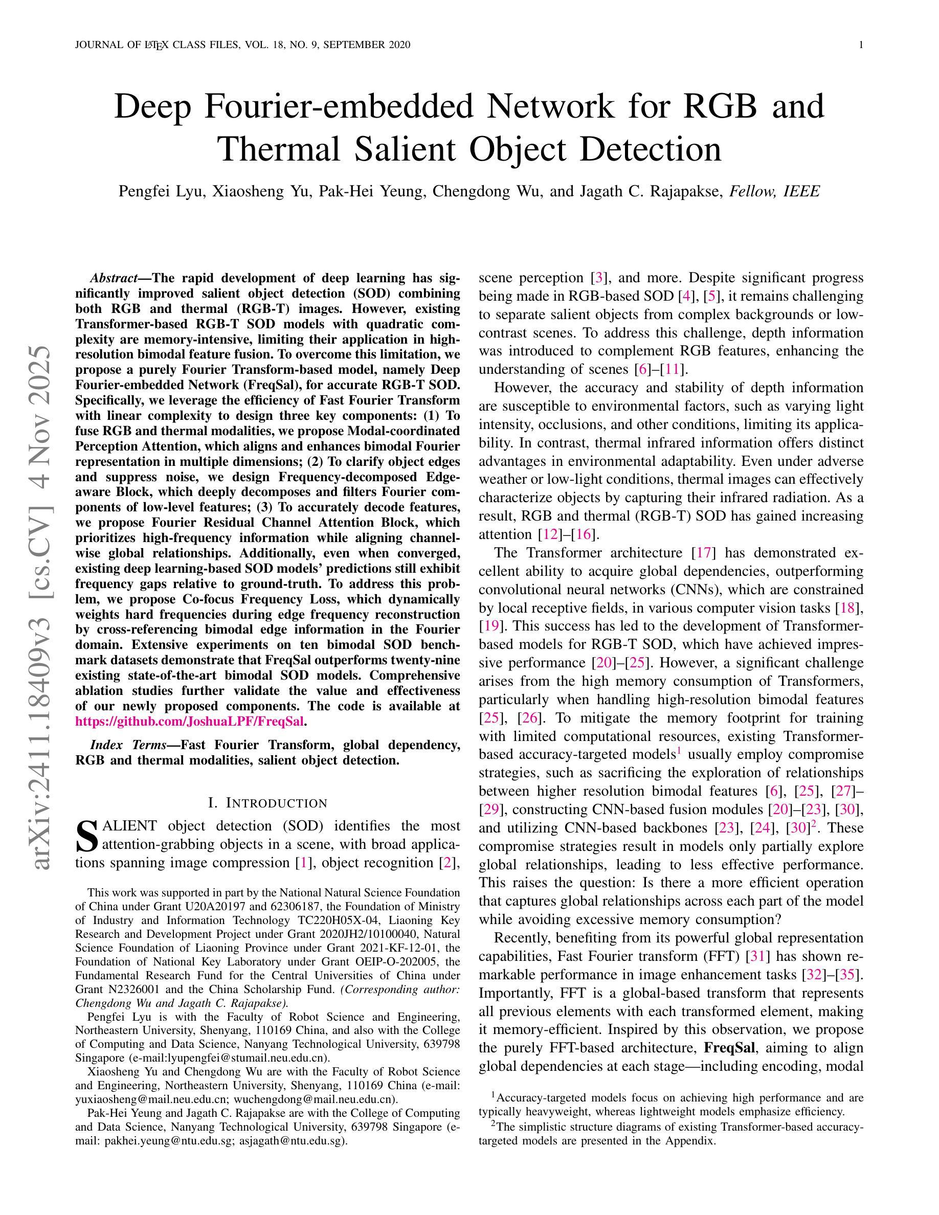 深度学习的快速发展显著提高了结合RGB和红外热成像(RGB-T)图像的显著性目标检测(SOD)能力。针对现有基于Transformer的RGB-T SOD模型内存密集、复杂度为二次方的问题,我们提出了一种基于纯傅里叶变换的模型——Deep Fourier-embedded Network(FreqSal),用于准确的RGB-T SOD。该模型利用具有线性复杂度的快速傅里叶变换的高效性,设计了三个关键组件以提高性能。此外,我们还引入了Co-focus Frequency Loss,以动态权重处理边缘频率重建中的硬频率。实验证明,FreqSal在十种双模态SOD基准数据集上的表现优于二十九种最先进的双模态SOD模型。