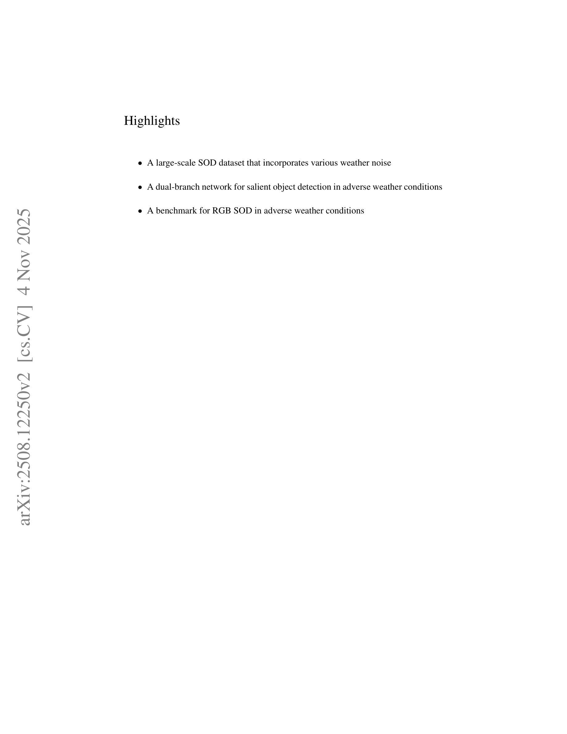 在复杂环境中进行显著性目标检测(SOD)仍然是一个充满挑战的研究课题。当前的方法在自然场景中表现良好,但对噪声的影响研究较少。为了解决这一问题,本文引入了全新的天气扩展显著性目标检测(WXSOD)数据集,包含带有像素级标注的RGB图像。同时,基于WXSOD数据集提出了有效的基线模型——天气感知特征聚合网络(WFANet)。该网络采用全监督的两分支架构,天气预测分支挖掘与天气相关的深度特征,显著性检测分支融合语义特征与天气特征进行SOD。与现有方法相比,WFANet在WXSOD上表现优越。