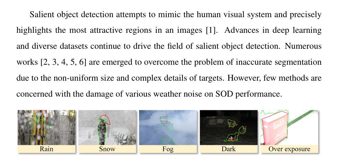 - 现存方法多在自然场景且低噪声条件下表现良好,但天气噪声对SOD性能的影响研究不足。