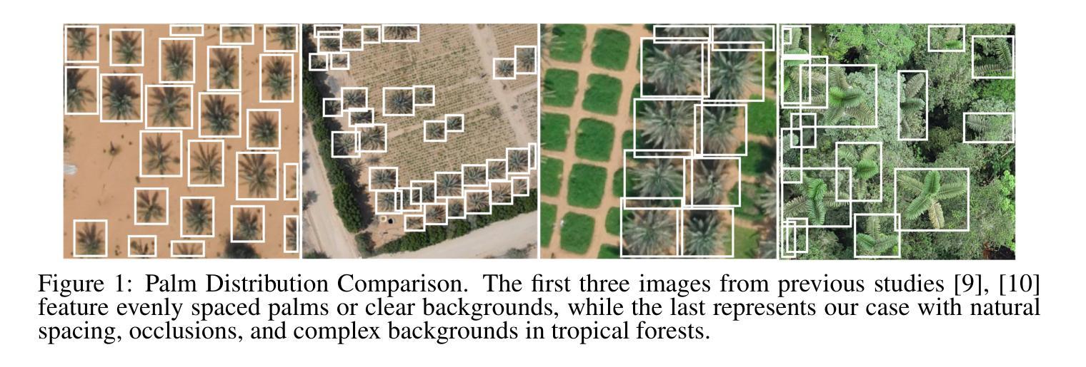 - 在密集森林中自然生长的棕榈树检测面临诸多挑战,如树冠重叠、阴影不均和景观异质性等。