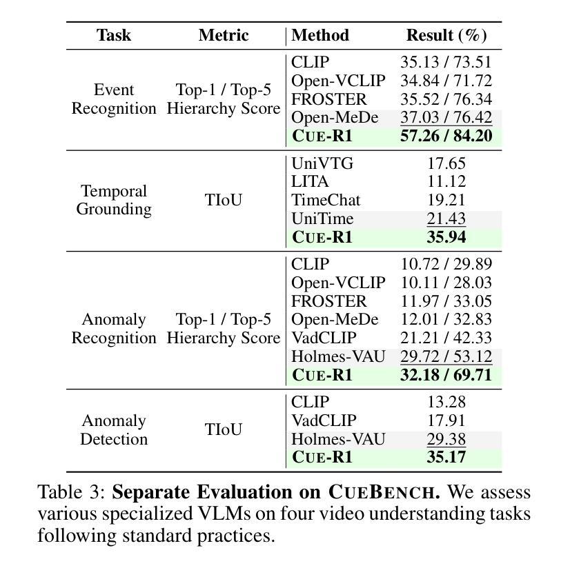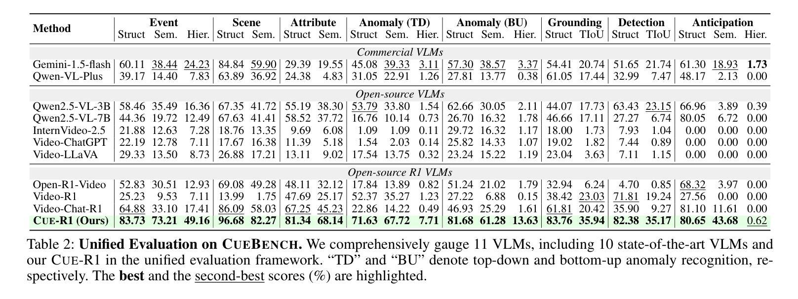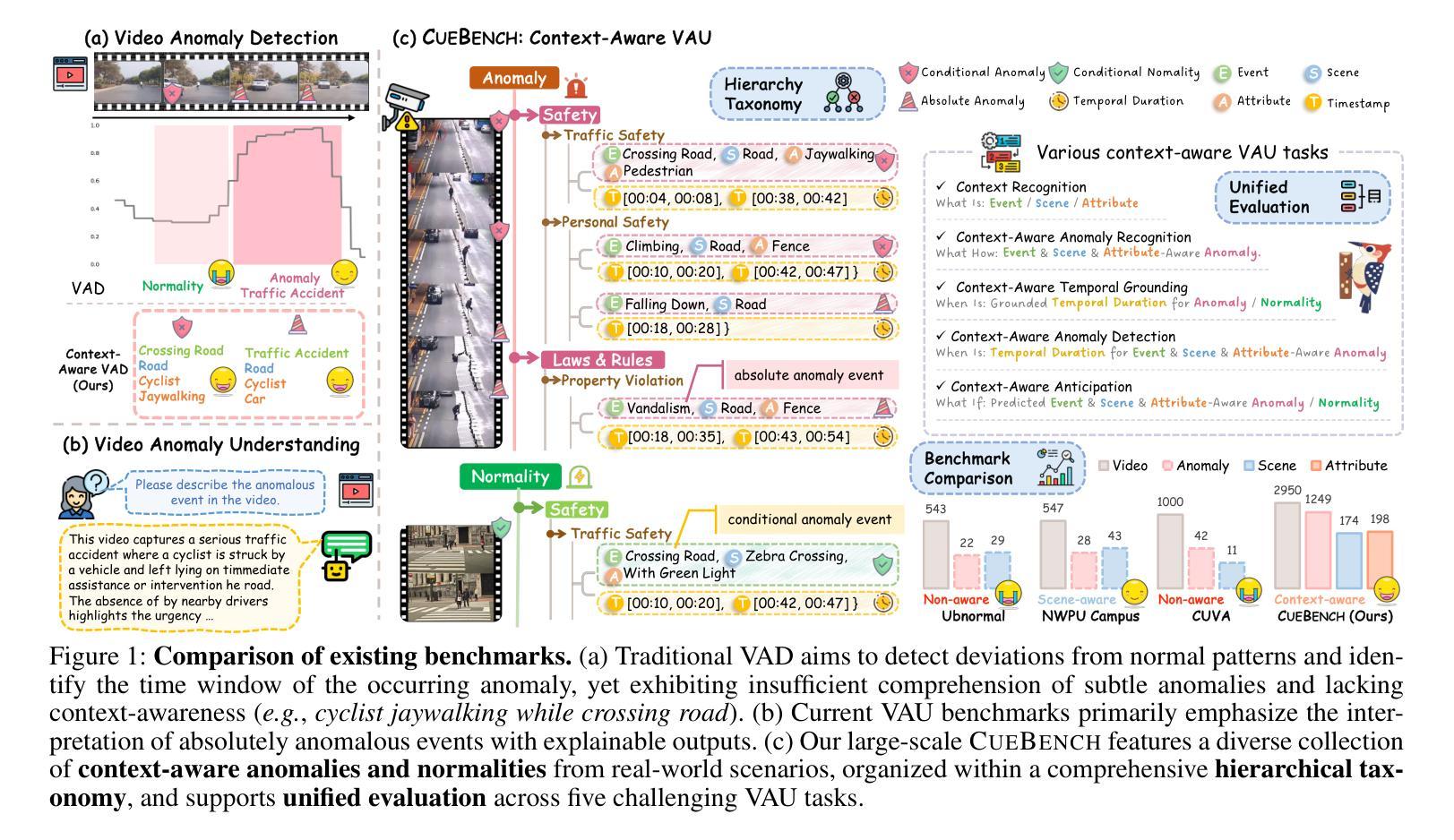 - CueBench是一个专门用于上下文感知视频异常的基准测试,建立了以事件为中心的分层次分类法。