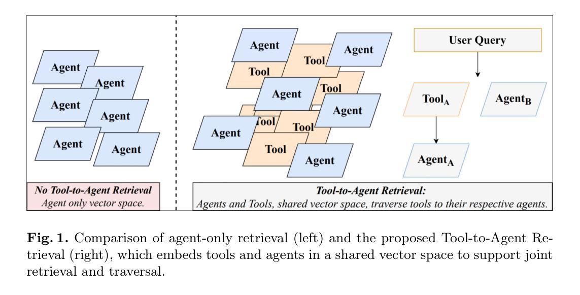 - 工具到代理检索框架将工具和代理嵌入同一向量空间,并通过元数据连接。