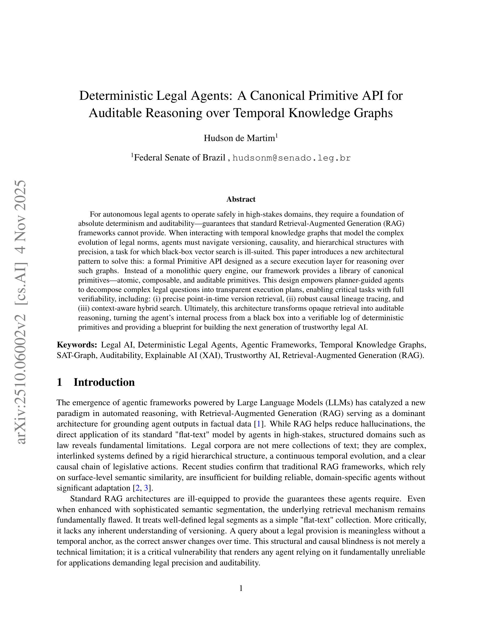 在这个文本中,主要讨论了在法律领域的自主智能代理需要具备的条件以及如何建立一个适合自主智能代理在高风险领域中运作的新架构模式。自主智能代理需要在复杂法律准则的时间演变模型上进行推理操作,并且需要有确定性、审计性作为基础保证,标准检索增强生成框架无法满足这一需求。文中引入了一种新的架构模式,即通过构建形式化原始API来实现推理和安全执行层,以处理时间知识图谱。该架构采用原子、可组合和可审计的原始库来支持计划导向的代理进行复杂法律问题的分解,实现精确的点时版本检索、稳健的因果谱系追踪和上下文感知混合搜索等任务。最终,该架构将模糊检索转化为可审计推理,将代理的内部过程从黑箱转变为可验证的确定性原始日志,为构建下一代可信法律AI提供了蓝图。