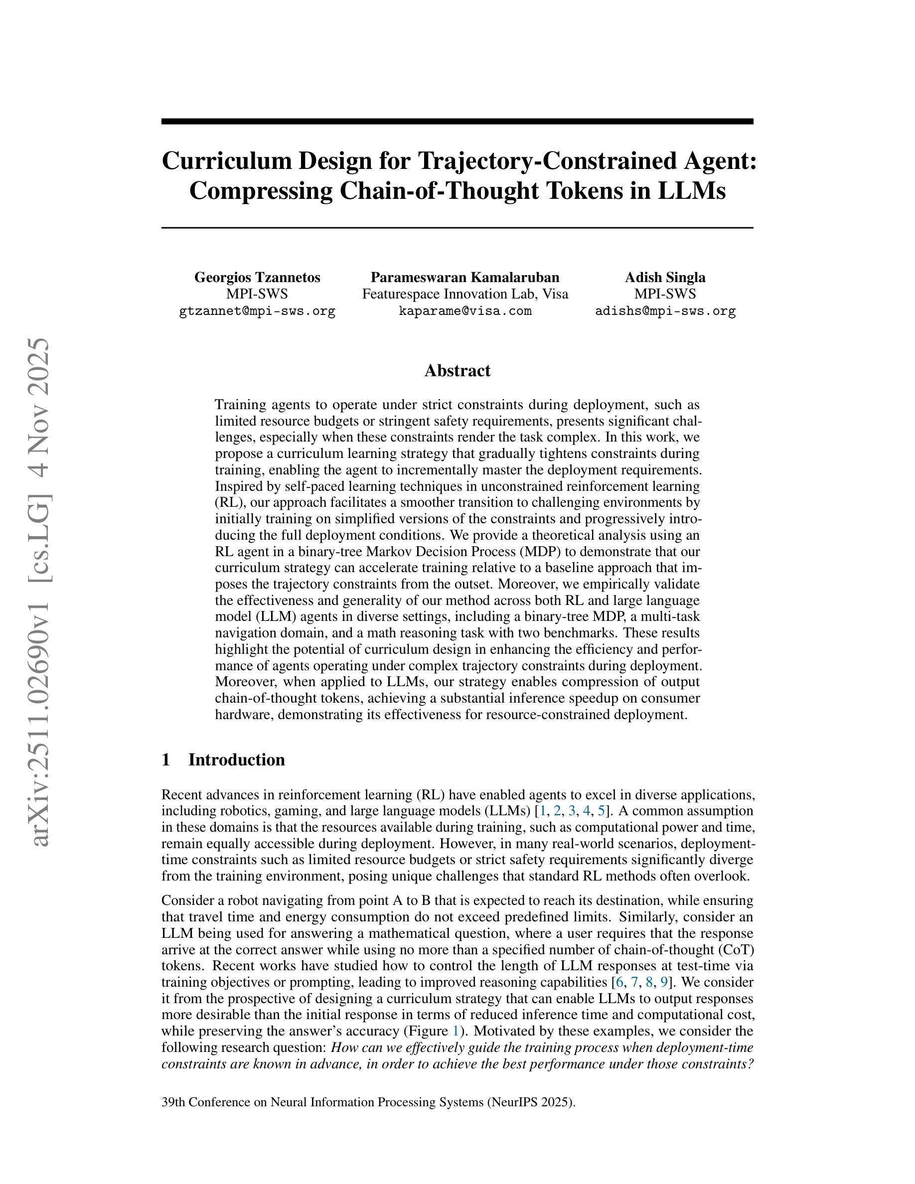 在部署期间,训练智能体在严格的约束条件下进行操作,如有限的资源预算或严格的安全要求,带来了巨大的挑战,尤其是当这些约束使任务变得复杂时。在此工作中,我们提出了一种课程学习策略,该策略在训练过程中逐渐加强约束,使智能体能够逐步掌握部署要求。我们的方法受到无约束强化学习(RL)中的自我进度学习技术的启发,通过最初在约束的简化版本上进行训练,并逐步引入完整的部署条件,实现向具有挑战性的环境的平稳过渡。我们使用一个在二叉树马尔可夫决策过程(MDP)中的RL智能体进行理论分析,以证明我们的课程策略可以加速训练,相对于一种从一开始就施加轨迹约束的基线方法。此外,我们通过强化学习和大型语言模型(LLM)智能体在多种环境中的实证研究验证了我们的方法的有效性和通用性,包括二叉树MDP、多任务导航域和数学推理任务的两项基准测试。这些结果凸显了课程设计在提升部署期间处于复杂轨迹约束下的智能体的效率和性能方面的潜力。此外,当应用于LLM时,我们的策略能够实现输出思维链代币的压缩,在消费者硬件上实现了推理的实质性加速,证明了其在资源受限部署中的有效性。