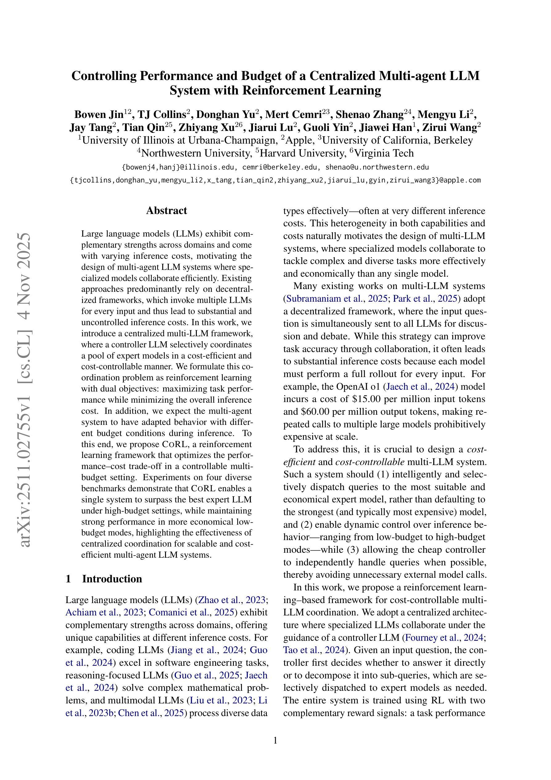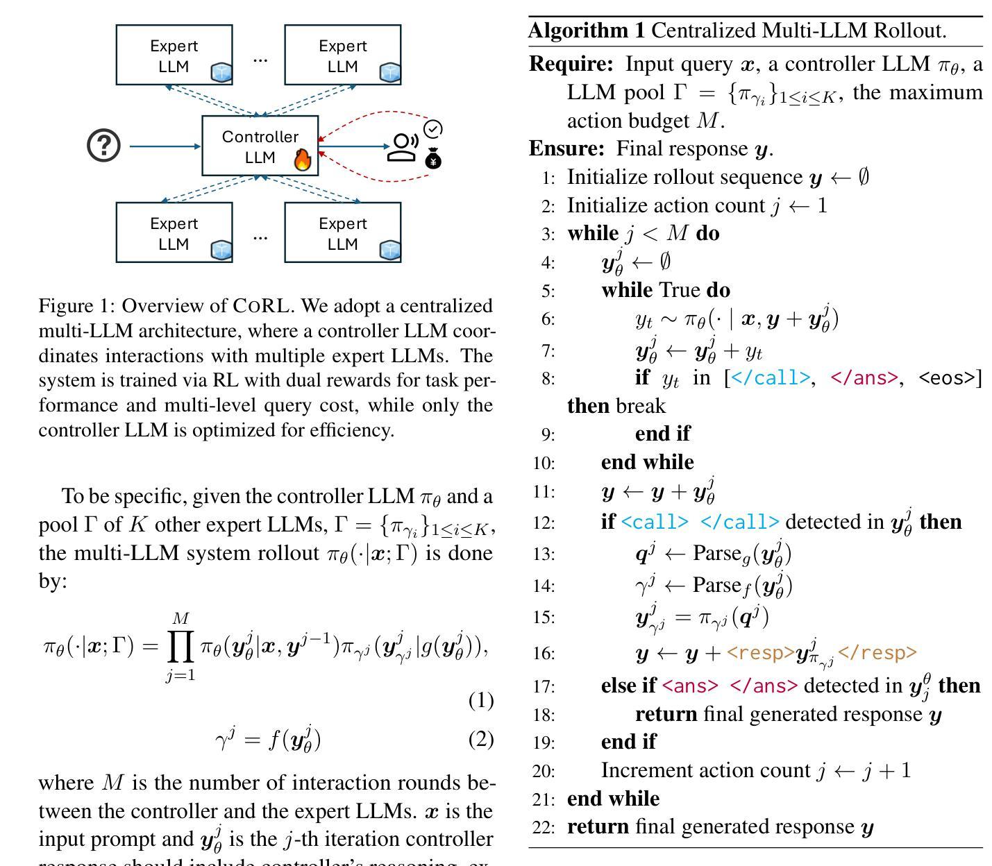本文介绍了一种集中式的多LLM框架,通过控制器LLM选择性地协调专家模型池,以高效、可控的方式实现成本优化。该问题被公式化为具有双重目标的强化学习问题:在最小化总体推理成本的同时最大化任务性能。实验表明,CoRL框架能够在多预算设置下优化性能成本权衡,使单一系统在预算充足时超越最佳专家LLM,同时在预算较低时也能保持强劲性能。