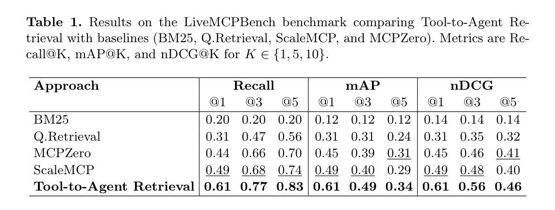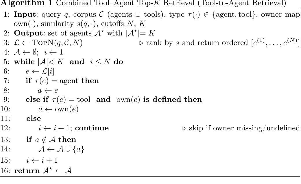 - 工具到代理检索确保代理和其工具在语境中的同等代表性,避免了语境稀释问题。