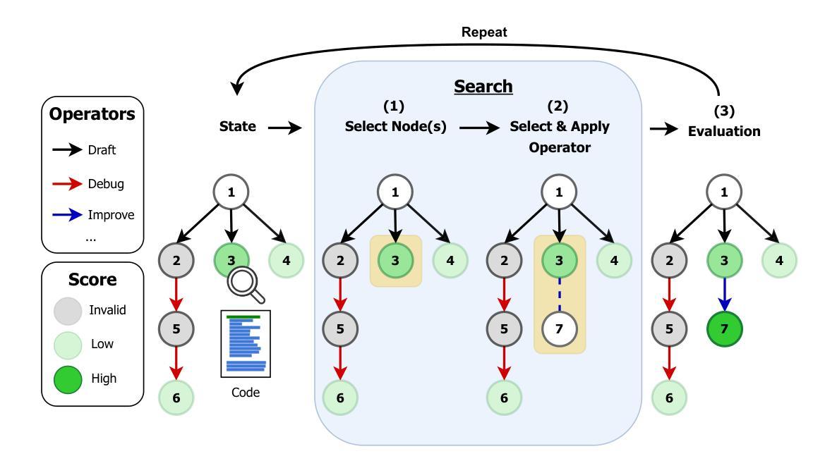 人工智能研究代理通过自动化机器学习模型的设计、实施和培训,显示出加速科学进步的巨大潜力。我们关注在提高代理在MLE-bench上的性能的方法,这是一个具有挑战性的基准测试,代理在此与Kaggle竞赛中的其他参赛者竞争以解决现实世界中的机器学习问题。我们将人工智能研究代理形式化为搜索策略,这些策略在候选解决方案空间中导航,并通过运算符进行迭代修改。通过设计和系统地改变不同的运算符集和搜索策略(贪心、MCTS、进化),我们证明它们的相互作用对于实现高性能至关重要。我们在搜索策略和运算符集的最佳配对上,在MLE-bench lite上取得了最新结果,将赢得Kaggle奖牌的成功率从39.6%提高到47.7%。我们的调查强调了联合考虑搜索策略、操作员设计和评估方法对于推动自动化机器学习的重要性。