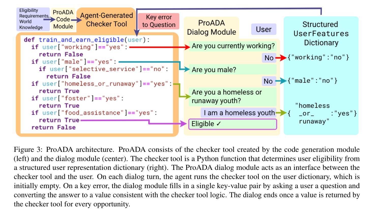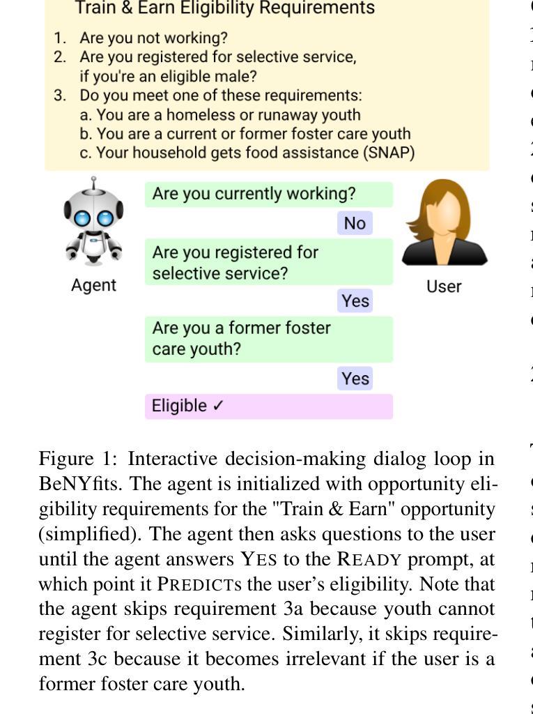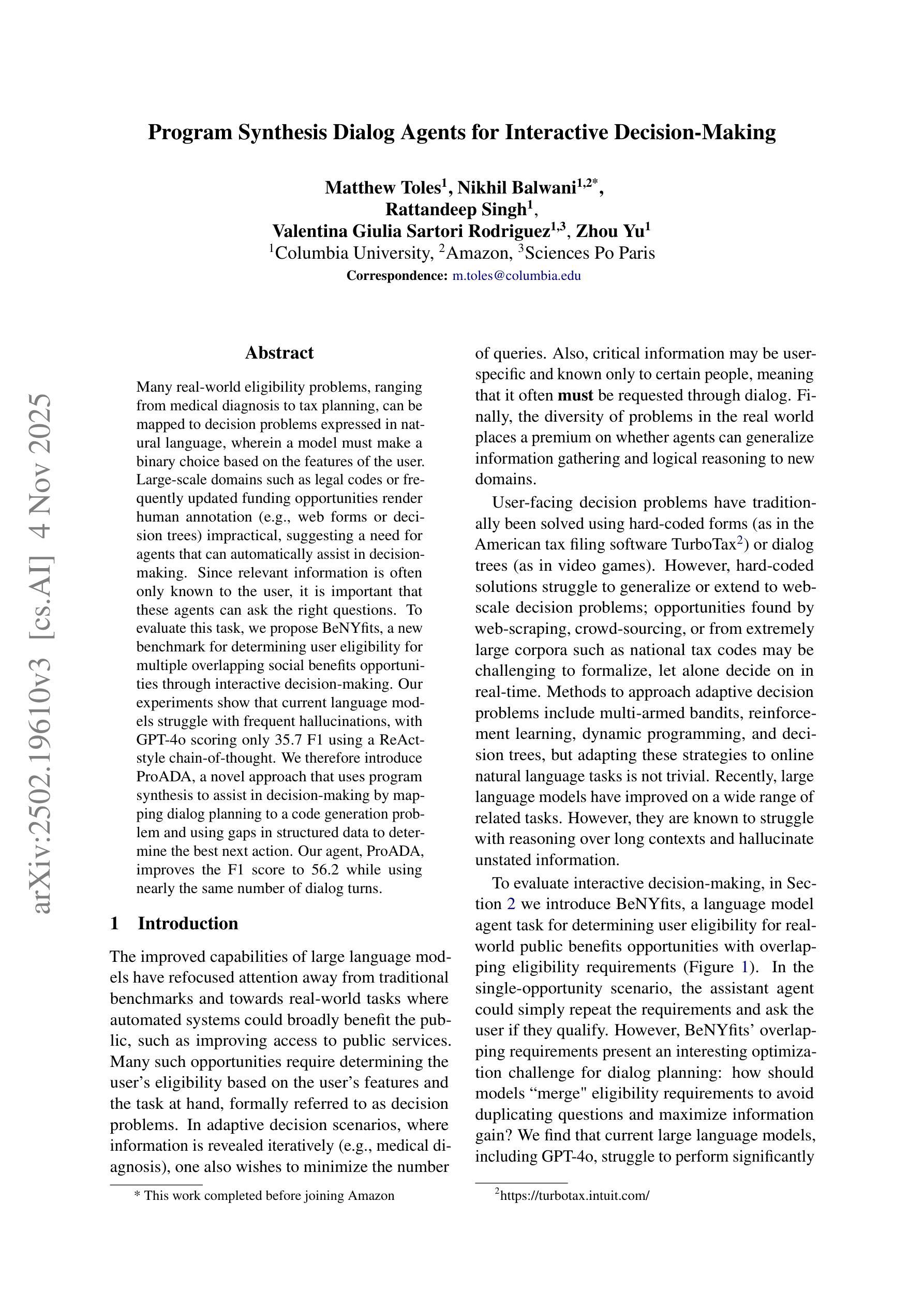 本文探讨了现实世界中从医疗诊断到税务规划等多元化领域中的用户资格决策问题。文章指出在这些大规模且频繁更新的领域中,人工标注的不实用性,强调需要能够自动协助决策的智能代理。这些代理需要提出关键问题并确定何时结束对话,同时面临准确性与提问数量之间的权衡。为评估此任务,文章提出了BeNYfits基准测试,用于衡量用户在多重重叠的社会福利机会下的资格。实验显示现有语言模型存在频繁误判问题,GPT-4o的F1分数仅为35.7。为解决此问题,文章提出了ProADA新方法,通过对话计划映射到代码生成问题并利用结构化数据中的空白来确定最佳下一步行动。使用ProADA的智能代理将F1分数提升至55.6,同时保持相近的对话轮次。