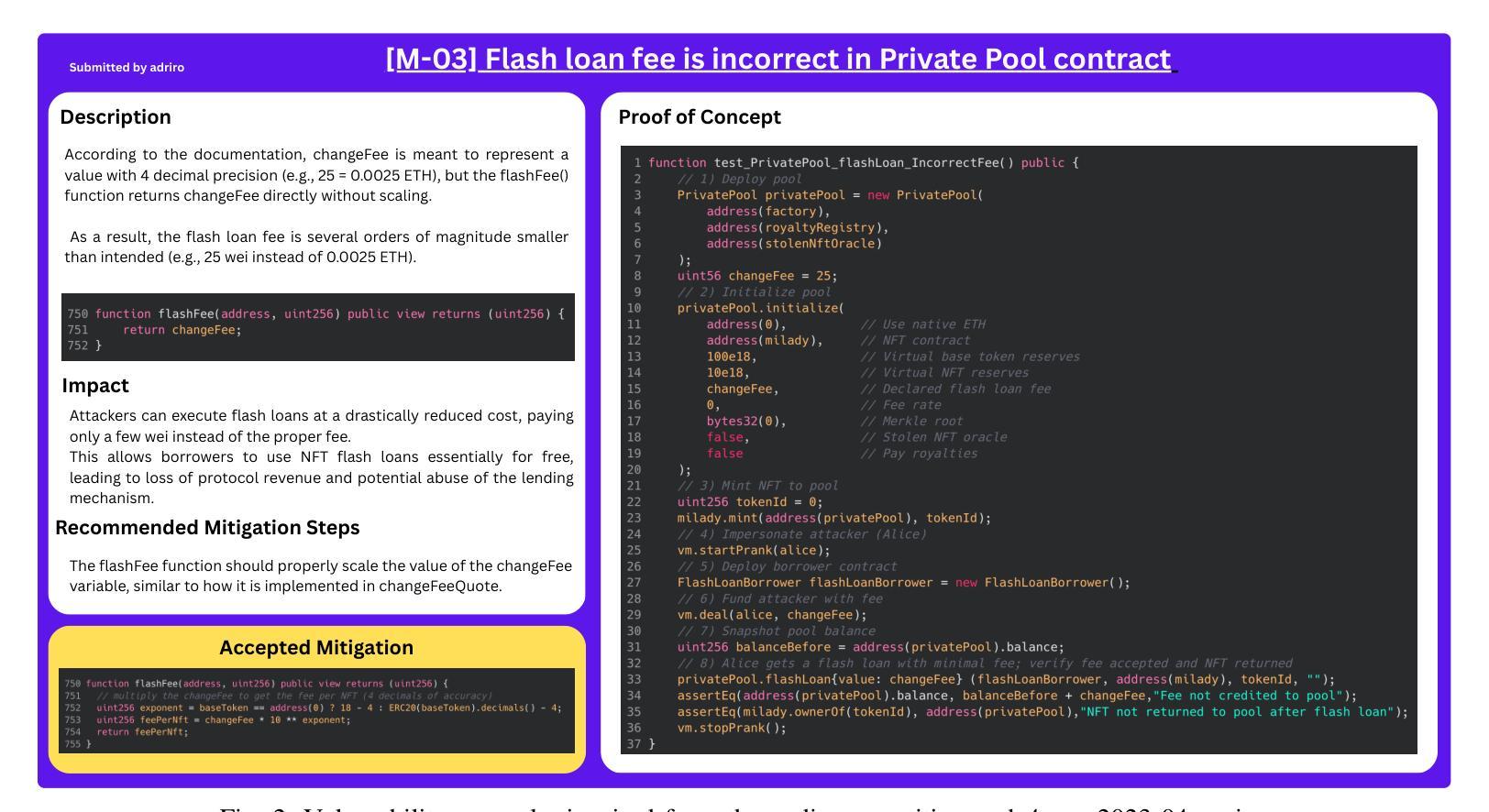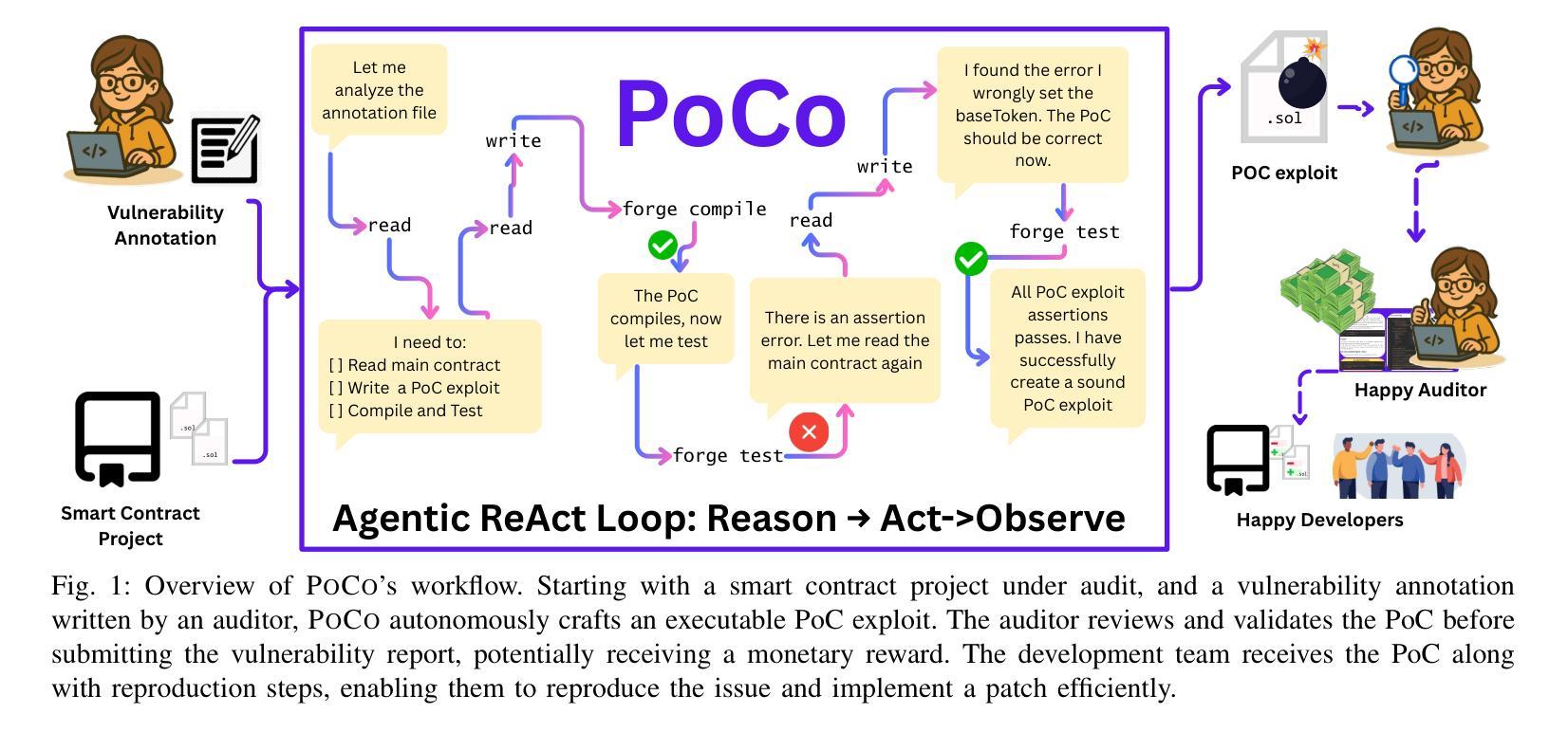 智能合约运行在一个高度对抗的环境中,其中存在的漏洞可能导致重大财务损失。因此,智能合约需要进行安全审计。在审计过程中,概念验证(PoC)攻击发挥着关键作用,向利益相关者证明报告的漏洞是真实存在的、可复制的并且可以采取行动。然而,手动创建PoC既耗时又容易出错,并且经常受到严格的审计时间表的限制。我们引入了POCO,这是一个自主框架,能够自动从审计员编写的自然语言漏洞描述中生成可执行PoC攻击。POCO通过在一个理性-行动-观察循环中与一组代码执行工具进行交互,以自主的方式生成PoC攻击。它产生与Foundry测试框架兼容的完全可执行的攻击,并准备好集成到审计报告和其他安全工具中。我们在包含现实世界漏洞报告的数据库上对POCO进行了评估。POCO始终优于提示和工作流基线,生成的PoC结构合理且逻辑正确。我们的结果证明自主框架可以大大减少高质量PoC在智能合约审计所需的工作量。我们的成果为智能合约安全社区提供了可立即采取行动的知识。