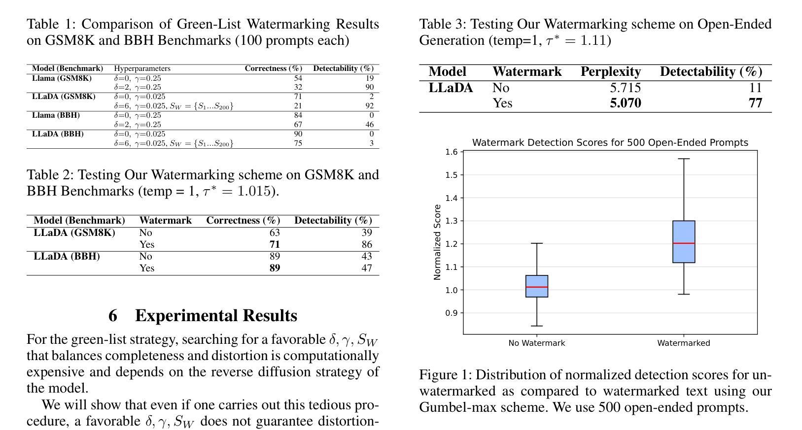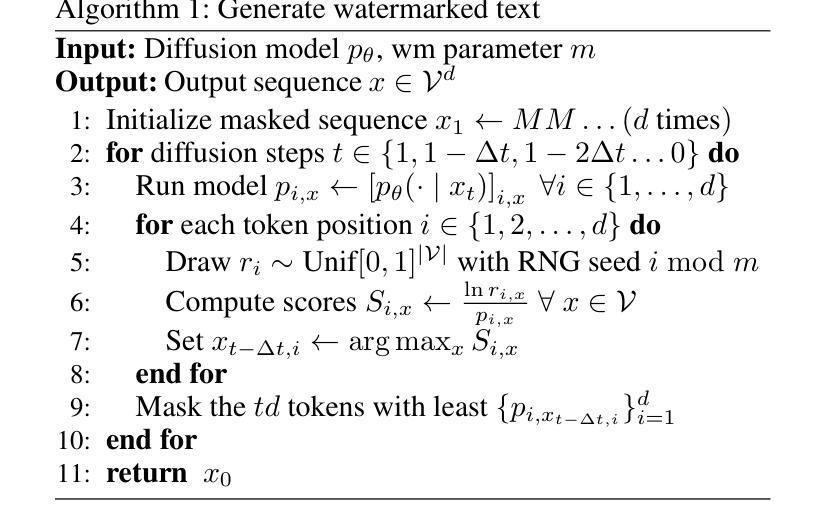 水印技术已成为追踪人工智能生成内容并将其与真实人类创作区分开来的有前途的技术。虽然先前的工作对自回归大型语言模型(LLM)和图像扩散模型的水印进行了广泛研究,但没有针对离散扩散语言模型的研究,离散扩散语言模型由于其高推理吞吐量而越来越受欢迎。在本文中,我们通过在每个扩散步骤中应用保持分布的古姆贝尔-最大技巧,并以序列索引为随机性提供种子,从而实现了离散扩散模型的首个水印方法,以可靠地检测水印。我们实验证明我们的方案在先进扩散语言模型上能可靠检测水印,并通过分析证明它是无失真的,在令牌序列长度中误检的概率呈指数衰减。