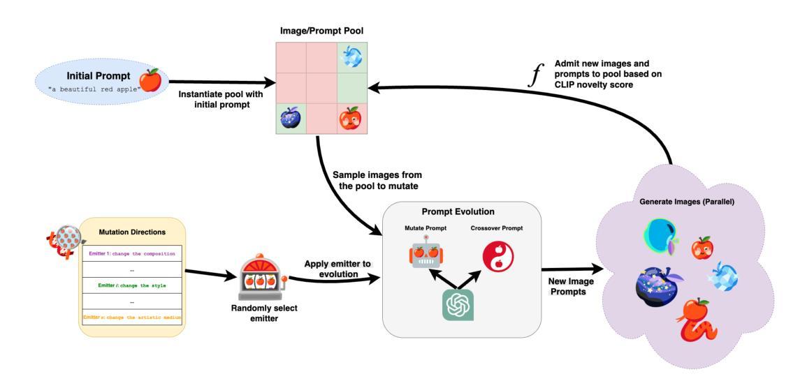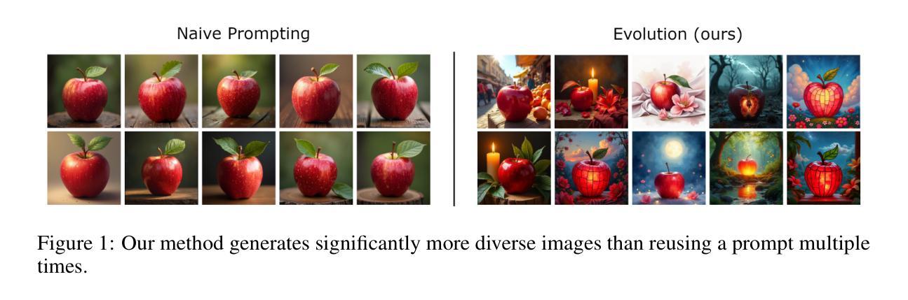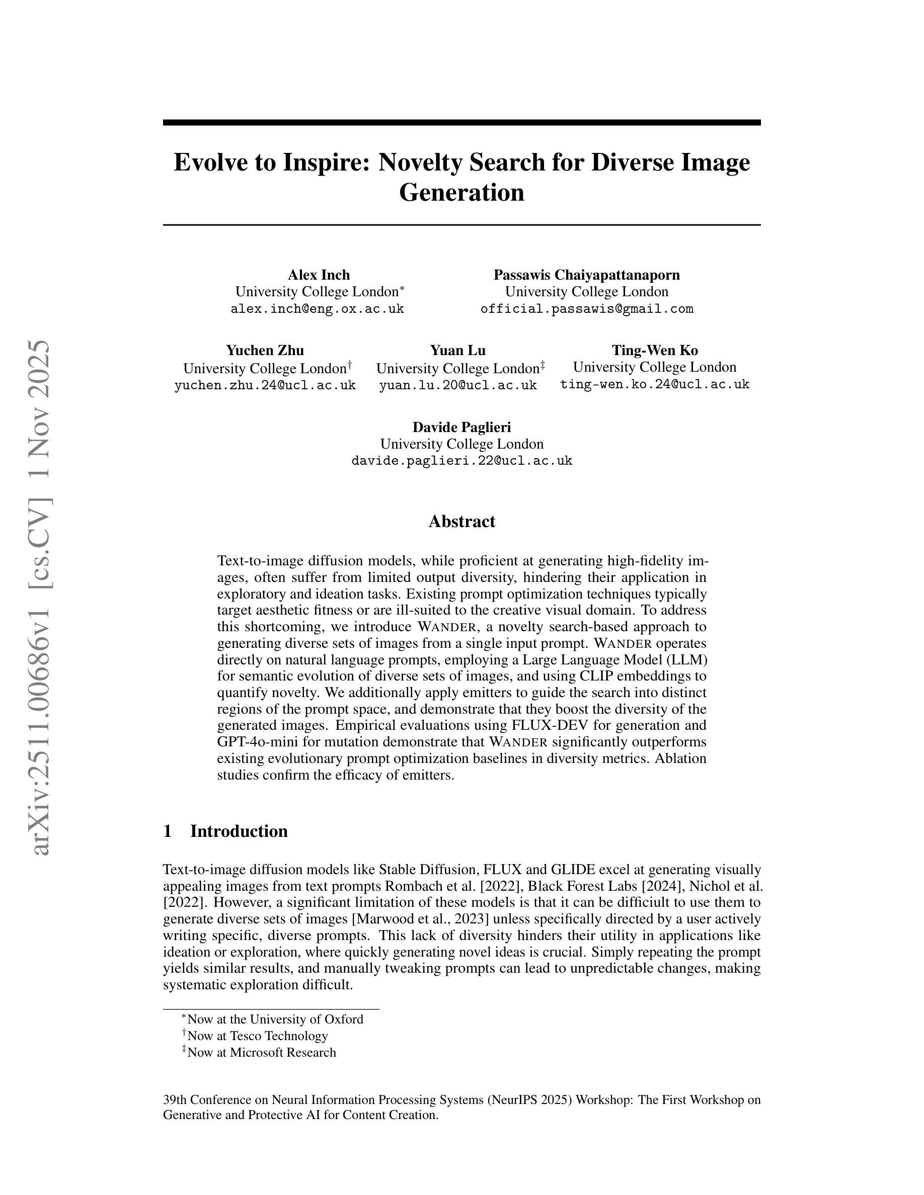 文本中的扩散模型虽然能够生成高质量图像,但输出的多样性受限,限制了其在探索和创意任务中的应用。现有提示优化技术主要针对美学适应性,并不适合创意视觉领域。为解决这一问题,本文提出了基于新颖性搜索的WANDER方法,从单个输入提示生成多样化的图像集。WANDER直接操作自然语言提示,利用大型语言模型进行图像集的语义演变,并使用CLIP嵌入来量化新颖性。此外,本文还应用发射器来引导搜索进入提示空间的特定区域,并证明其能提高生成图像的多样性。通过FLUX-DEV的生成和GPT-4o-mini的变异进行实证研究,表明WANDER在多样性指标上显著优于现有的进化提示优化基线。消融研究证实了发射器的有效性。