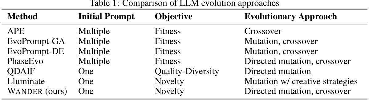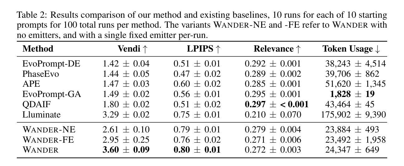 - 实证研究证明,WANDER在多样性指标上优于现有的进化提示优化基线。
