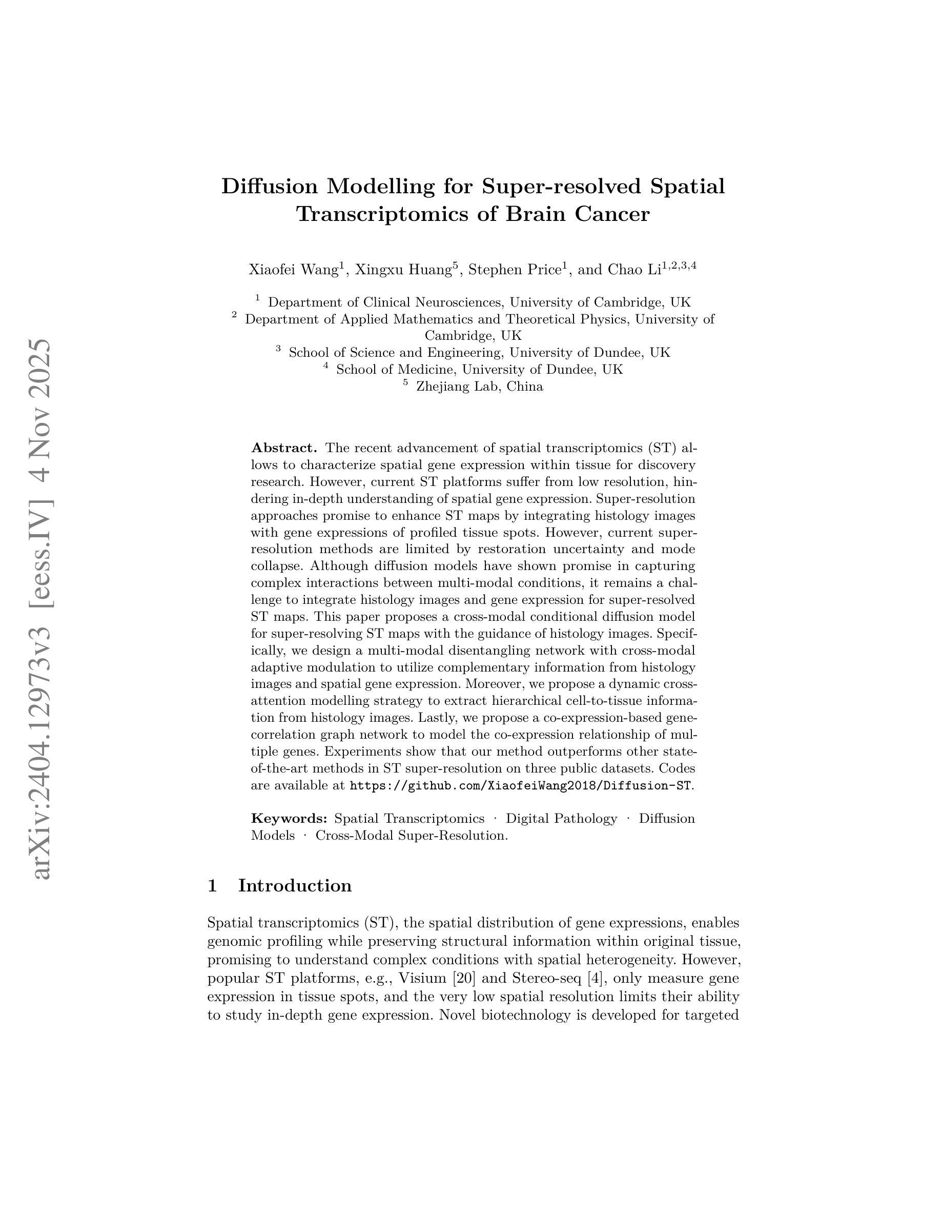 - 该论文提出了一种跨模态条件扩散模型,结合光镜图像指导ST图谱的超分辨率。