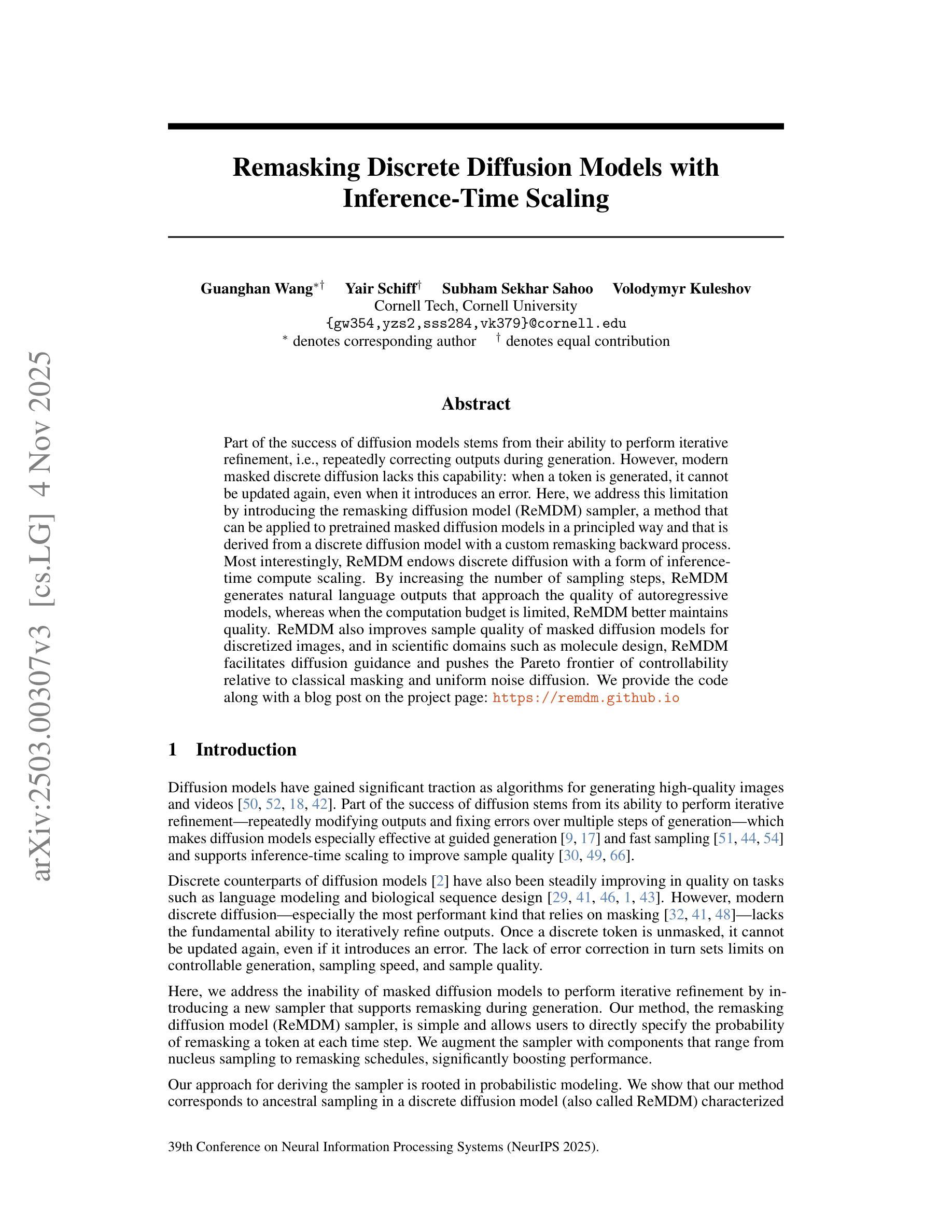 扩散模型的部分成功源于其进行迭代优化的能力,即生成过程中反复修正输出。然而,现代掩码离散扩散缺乏这种能力:一旦生成标记,即使出现错误,也无法再次更新。在这里,我们通过引入重新掩码扩散模型(ReMDM)采样器来解决这一局限性,这是一种可以应用于预训练掩码扩散模型的方法,它来源于具有自定义反向掩码过程的离散扩散模型。最有趣的是,ReMDM为离散扩散赋予了推理时间计算缩放的形式。通过增加采样步骤的数量,ReMDM生成的自然语言输出接近自回归模型的质量,而在计算预算有限的情况下,ReMDM能更好地保持质量。ReMDM还提高了离散图像掩码扩散模型的样本质量,在科学领域如分子设计方面,ReMDM促进了扩散指导并推动了与经典掩码和均匀噪声扩散相比的可控性帕累托前沿。我们已在项目页面上提供代码和博客文章:https://remdm.github.io。