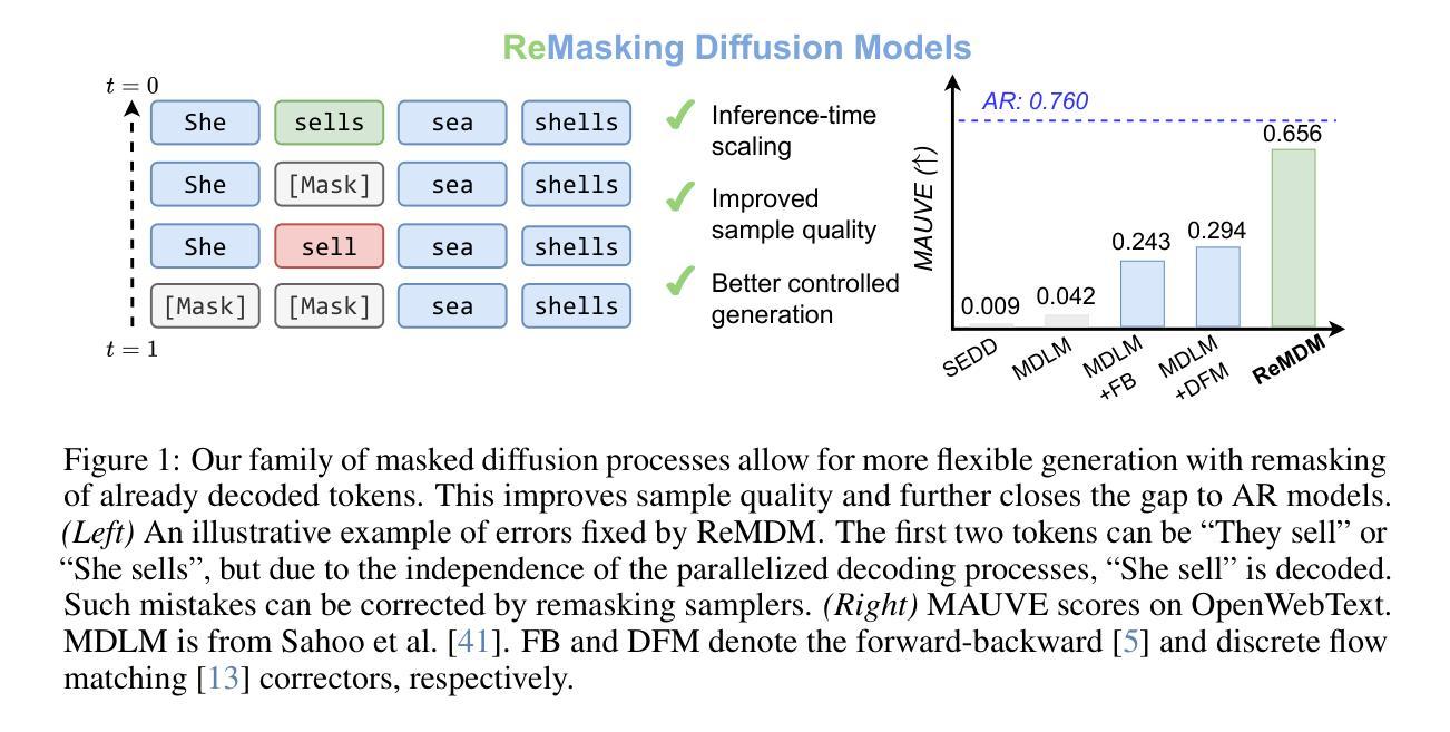扩散模型的一部分成功在于其能够进行迭代优化的能力,即生成过程中不断修正输出。然而,现代掩码离散扩散缺乏这种能力:一旦生成标记,即使出现错误也无法再次更新。针对这一问题,我们提出了重新掩码扩散模型(ReMDM)采样器方法,该方法可应用于预训练的掩码扩散模型,源自离散扩散模型,具有自定义的重新掩码反向过程。ReMDM赋予了离散扩散一种形式的推断时间计算缩放。通过增加采样步骤的数量,ReMDM生成的自然语言输出接近自回归模型的质量,而当计算预算有限时,ReMDM能更好地保持质量。此外,ReMDM还提高了掩码扩散模型在离散图像以及科学领域(如分子设计)的样本质量,并推动了相对于传统掩码和均匀噪声扩散的可控性的帕累托前沿。
