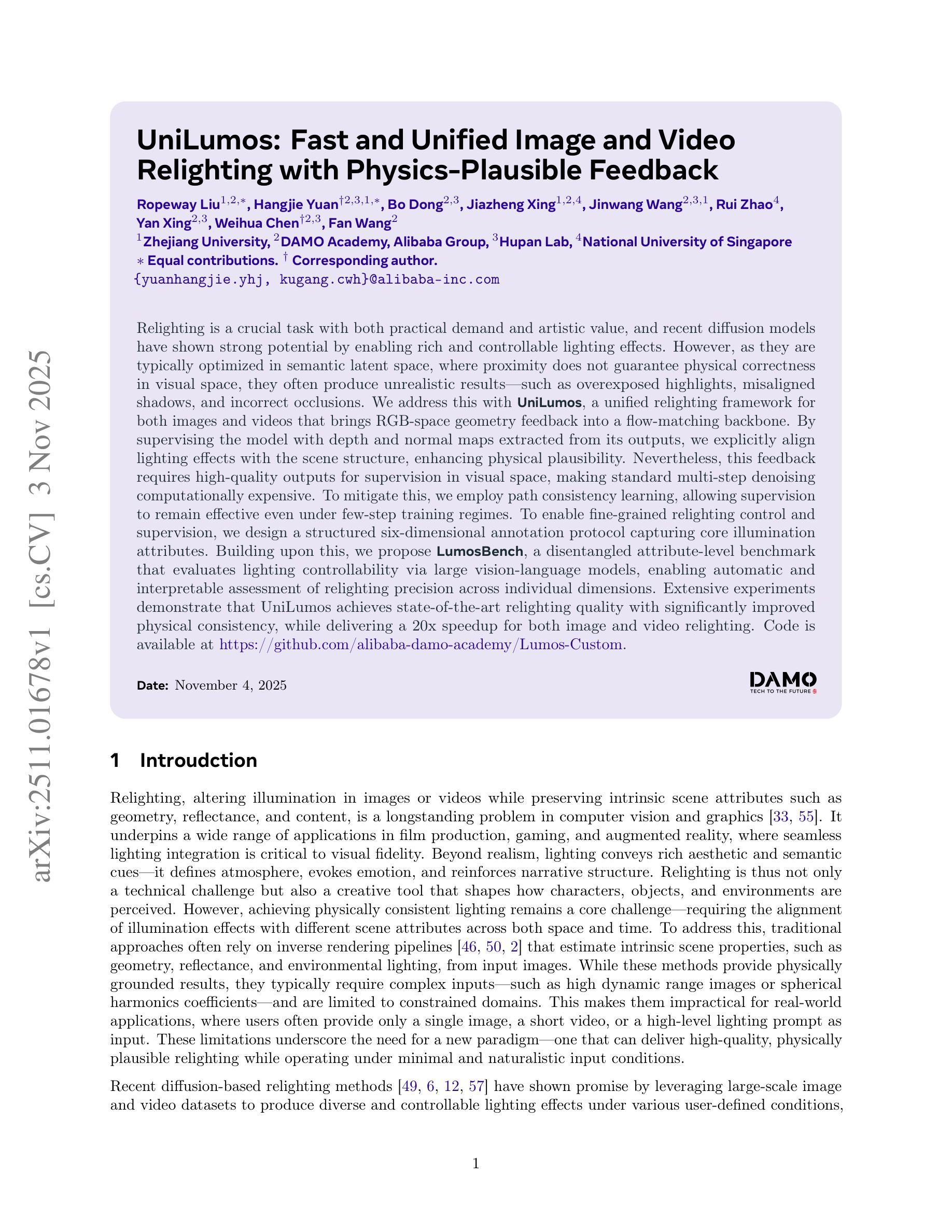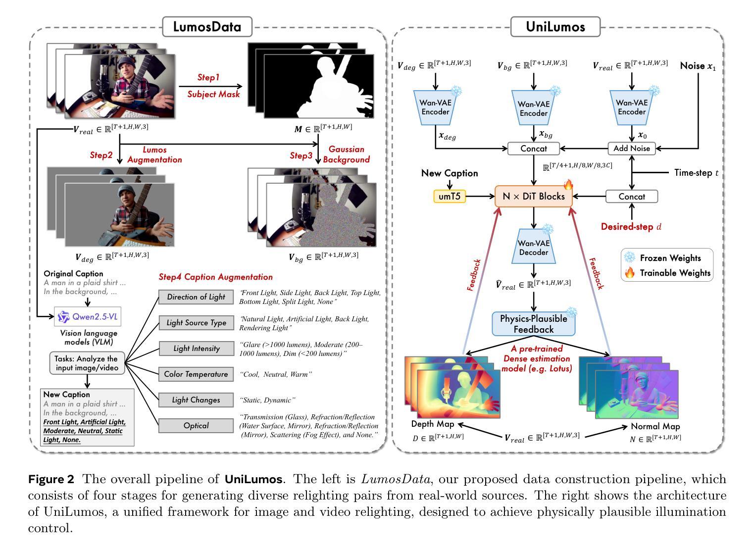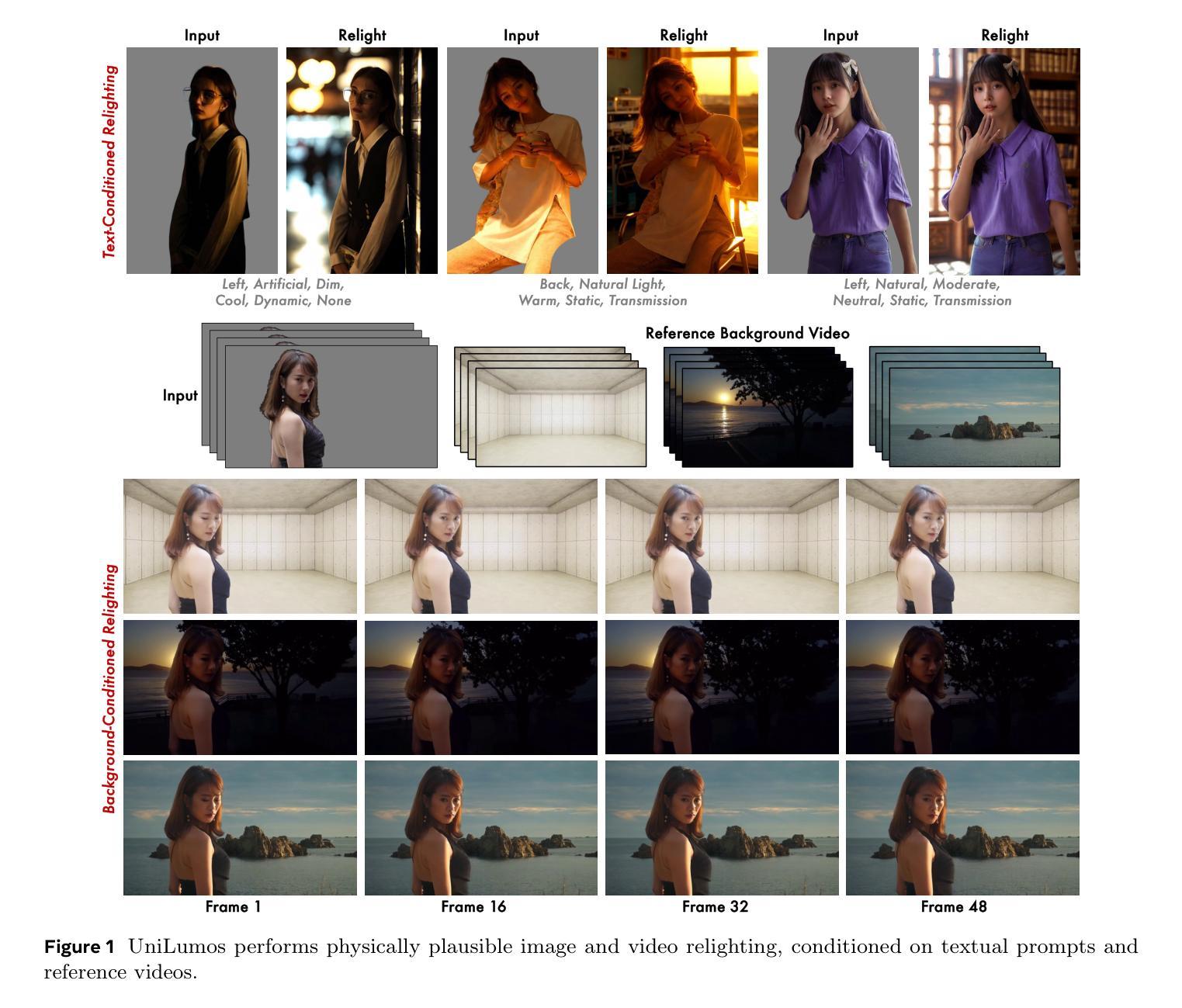 - UniLumos框架结合图像和视频重照明,通过RGB空间几何反馈提高物理合理性。