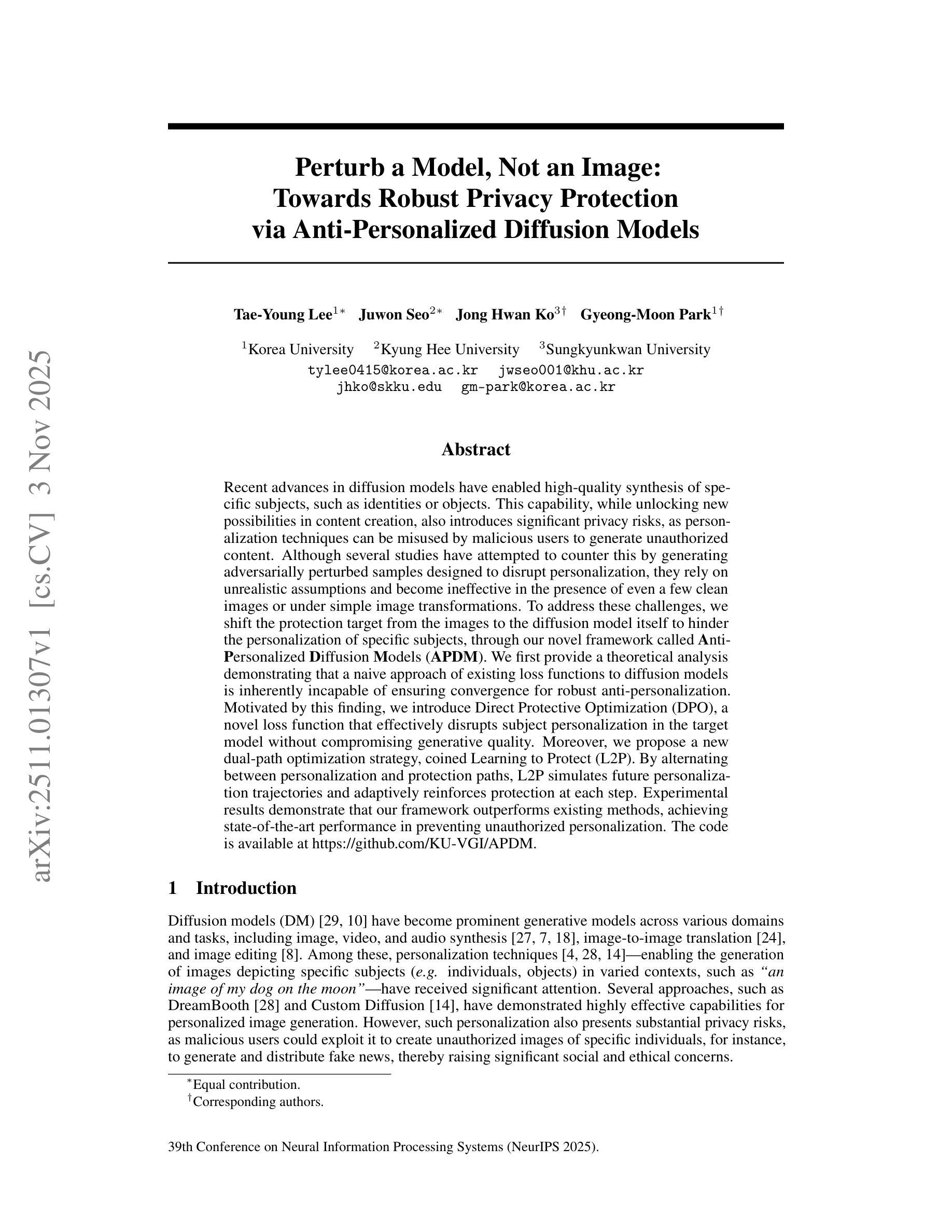 近期扩散模型的新进展能够实现特定主题的高质量合成,如身份或物体。然而,这种能力在解锁内容创作新可能性的同时,也带来了重大隐私风险。恶意用户可能滥用个性化技术来生成未经授权的内容。为了应对这一挑战,我们提出了一种名为Anti-Personalized Diffusion Models(APDM)的新型框架,旨在从扩散模型本身出发,阻止特定主题的个人化。我们引入了Direct Protective Optimization(DPO)和Learning to Protect(L2P)策略,有效阻断目标模型中的主题个人化,同时不损害生成质量。实验结果显示,我们的框架优于现有方法,达到防止未经授权个人化的最佳性能。