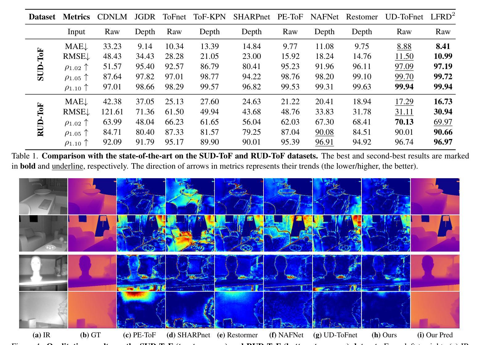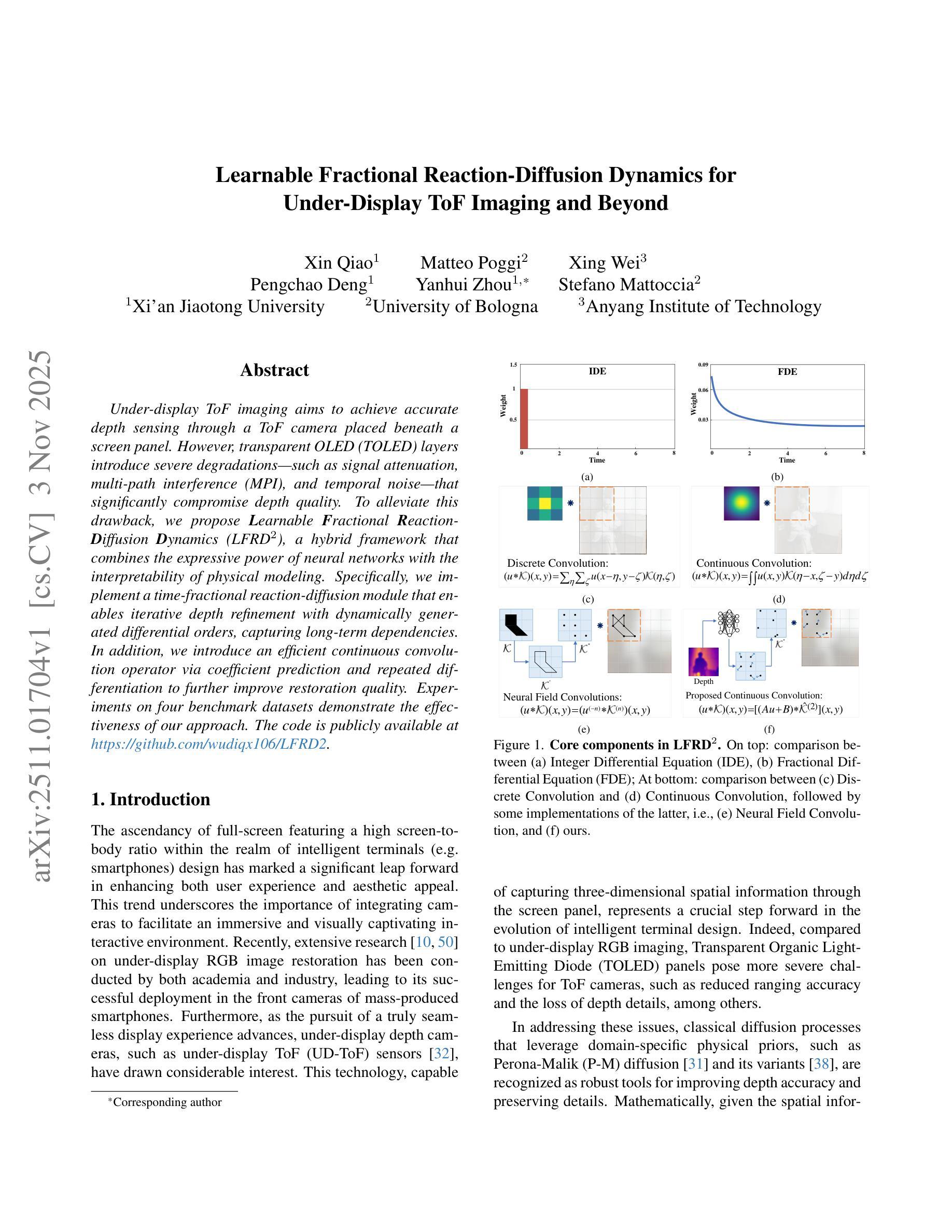 文本介绍了通过屏幕下方的ToF相机实现精准深度感知的难题,特别是透明OLED(TOLED)层导致的信号衰减、多路径干扰和时序噪声等问题严重影响了深度质量。为解决这些问题,提出了一种名为Learnable Fractional Reaction-Diffusion Dynamics(LFRD2)的混合框架,结合了神经网络的表现力和物理建模的可解释性。它通过时间分数反应扩散模块进行迭代深度优化,并引入高效的连续卷积算子以提高修复质量。实验证明该方法在四个基准数据集上均有效。代码已公开在GitHub上。