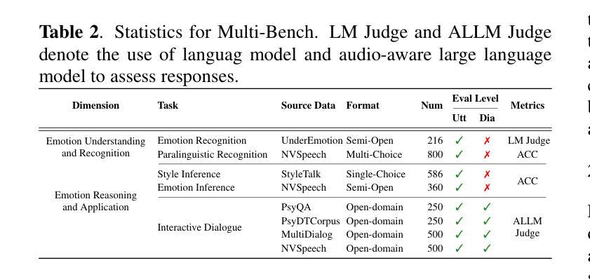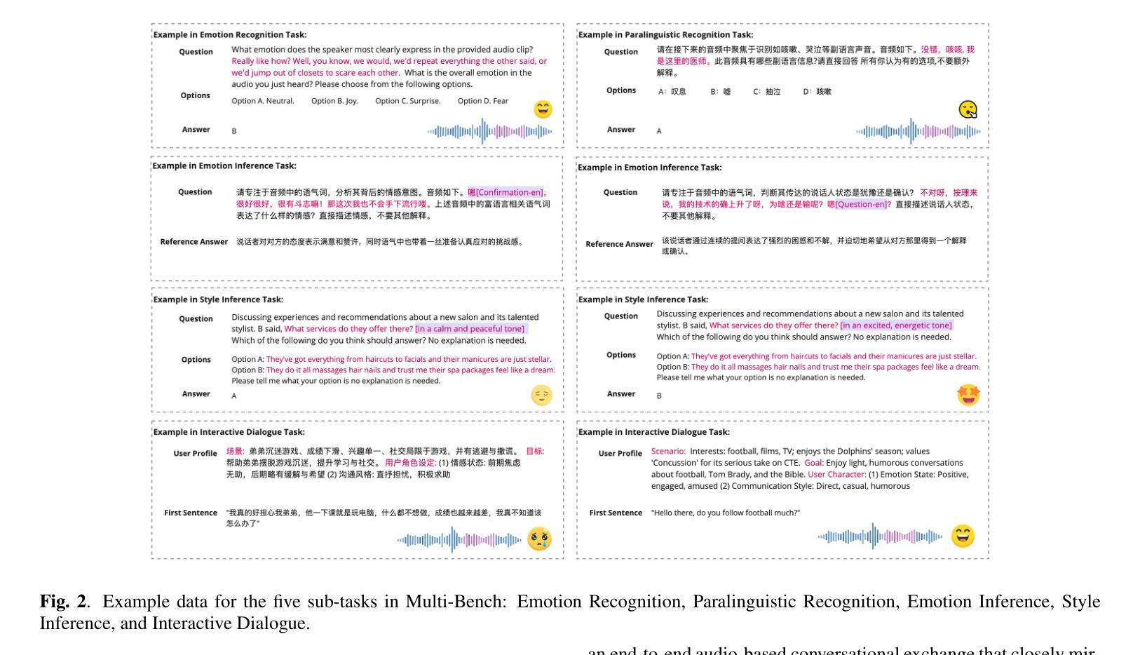 - 该基准测试包含五个任务,大约3.2K样本,涵盖从情感识别到复杂推理和交互式对话的各个方面。
