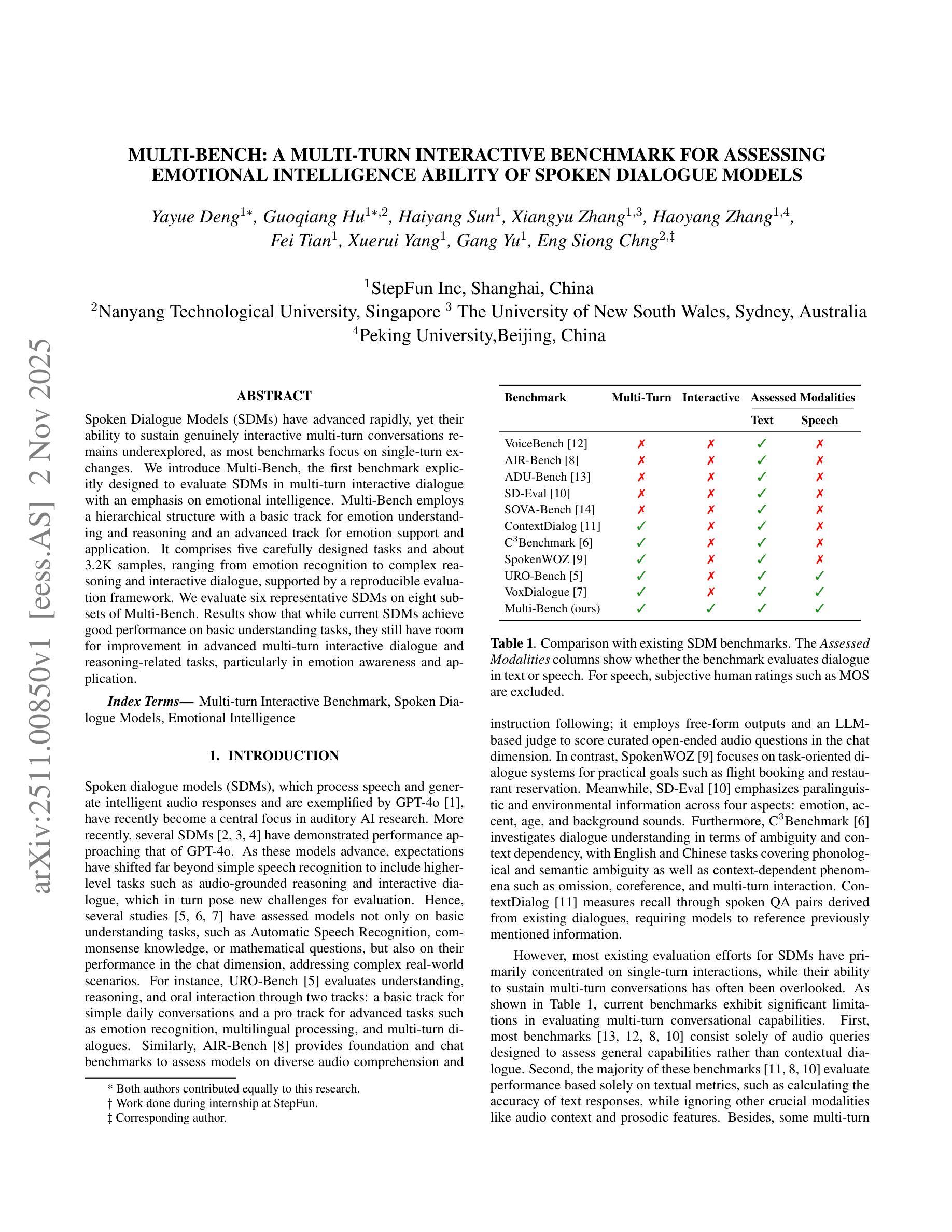本文介绍了多基准(Multi-Bench),这是一个专门为评估具有情感智能的多轮交互对话中的口语对话模型(SDMs)而设计的基准测试。它采用分层结构,包括基础的情感理解和推理轨道,以及高级的情感支持和应用程序轨道。通过五个精心设计的任务,约3.2K样本,从情感识别到复杂推理和交互式对话。对现有SDMs的评价结果表明,SDMs在基础理解任务上表现良好,但在高级多轮交互对话和推理相关任务中仍有提升空间,特别是在情感意识和应用方面。