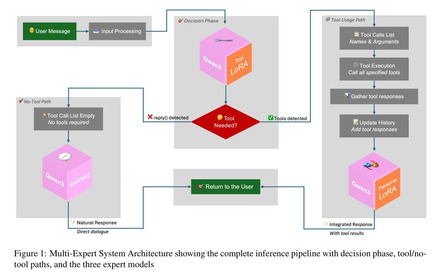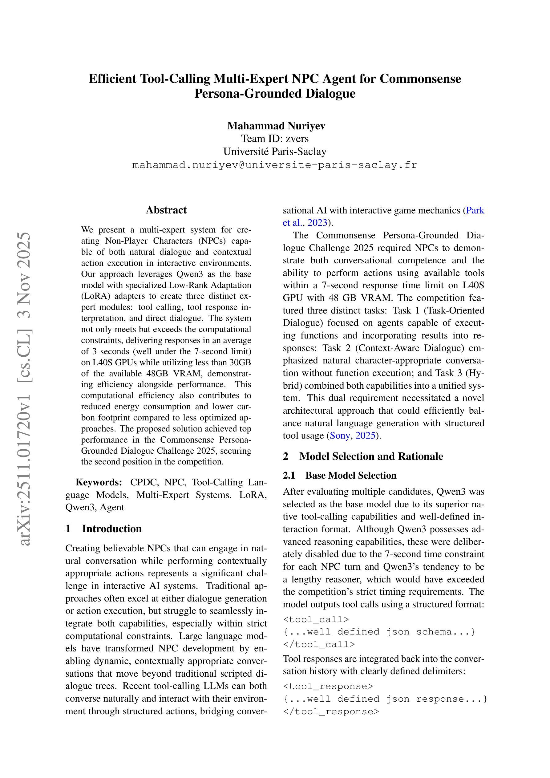 基于Qwen3模型和LoRA适配器,我们开发了一个多专家系统,用于创建能在互动环境中进行自然对话和进行情境动作的非玩家角色(NPC)。该系统实例化三位专家:工具调用、工具反应解读和直接对话专家。该方法满足了计算效率的要求,能在L40S GPU上快速响应并保持适度的资源使用率。在2025年常识人格化对话挑战中,我们的方法位列第二。