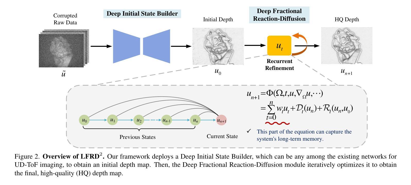 显示下方的飞行时间成像(ToF imaging)旨在通过屏幕面板下的飞行时间相机实现准确的深度感知。然而,透明OLED(TOLED)层引入了严重的退化问题,如信号衰减、多路径干扰(MPI)和时间噪声等,这些都会严重影响深度质量。为了缓解这一缺陷,我们提出了可学习的分数反应扩散动力学(LFRD2),这是一个结合了神经网络表现力和物理建模解释性的混合框架。具体来说,我们实现了一个时间分数反应扩散模块,该模块通过动态生成差分阶数,能够迭代优化深度,捕捉长期依赖关系。此外,我们还通过系数预测和重复微分引入了一种高效的连续卷积算子,以进一步提高恢复质量。在四个基准数据集上的实验证明了我们方法的有效性。代码公开在https://github.com/wudiqx106/LFRD2。